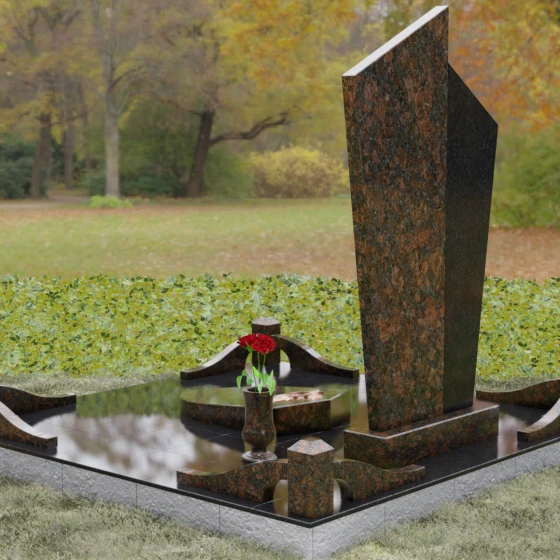Данная мемориальная композиция представляет собой воплощение архитектурной эстетики и глубокого символизма. Выбор этой модели продиктован её уникальной асимметричной формой, которая отходит от классических канонов в сторону современного монументального искусства. Стела состоит из двух сопряженных сегментов, выполненных в контрастной цветовой гамме, что позволяет подчеркнуть многогранность личности усопшего. Левая часть, обладающая выраженной фактурой натурального камня, служит идеальным фоном для размещения наградной символики, в то время как правая — глубоко черная, зеркально отполированная панель — предназначена для основного портрета и памятных надписей.