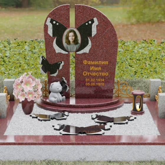 Центральным элементом ансамбля выступает величественная вертикальная стела, разделенная узким вертикальным просветом на две симметричные части. Этот архитектурный прием создает эффект воздушности и позволяет свету проникать сквозь плотную массу камня, символизируя открытость небесных врат и свободу духа. Верхушка стелы оформлена плавным полукруглым изгибом, лишенным острых углов, что дарит ощущение абсолютного умиротворения и вечного покоя. Главным художественным акцентом является мастерски выполненная инкрустация в виде расправленных крыльев бабочки, которые бережно обрамляют центральный овальный портрет. Контрастная игра фактур — зеркально-черного полированного гранита и насыщенных красных вставок с белым природным рисунком — создает поразительный визуальный объем. Изящная золоченая гравировка шрифта придает оформлению особую торжественность, отчетливо выделяясь на темном фоне камня и сохраняя читаемость на долгие десятилетия.