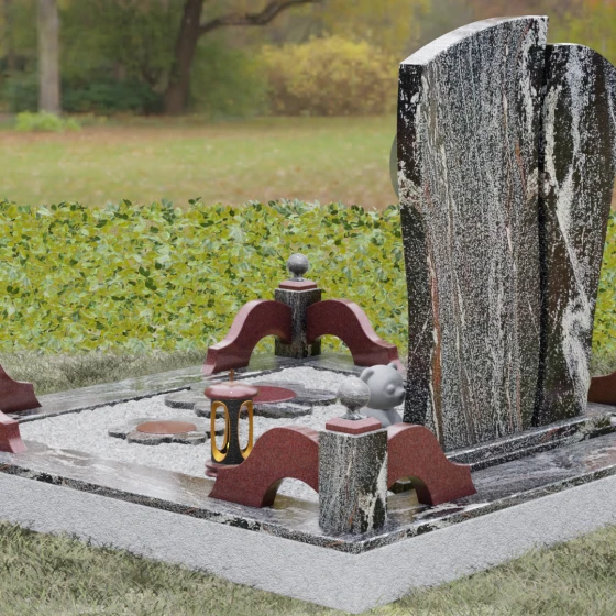 Мастерство камнереза здесь проявляется в каждой детали: от точно выверенных изгибов основной плиты до малых декоративных цветов у подножия, которые словно «прорастают» сквозь твердый гранит. Благоустройство участка выполнено в едином стилистическом ключе, создавая законченный и торжественный вид. Основание памятника опирается на сложный многоуровневый цоколь. Массивный каменный бордюр с плавными волнообразными линиями обрамляет место захоронения, обеспечивая эстетическую чистоту и легкость в уходе. Углы композиции акцентированы изящными столбиками с навершиями в виде полированных шаров, а установленная каменная лампада и скульптурная фигурка медвежонка добавляют мемориалу особую душевную теплоту и индивидуальность.