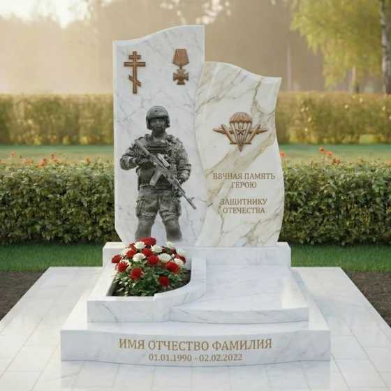 Правая стела, немного ниже и уже левой, имеет более динамичную, волнообразную форму. Ее верхняя часть плавно изгибается, создавая ощущение движения и легкости, несмотря на массивность камня. Лицевая сторона этой стелы также тщательно отполирована. В верхней части выгравирован символ Воздушно-десантных войск — парашют с крыльями, выполненный в золотистом цвете, что придает ему особую выразительность и значимость. Под ним располагаются проникновенные слова: "ВЕЧНАЯ ПАМЯТЬ ГЕРОЮ ЗАЩИТНИКУ ОТЕЧЕСТВА", выгравированные четким шрифтом, которые служат данью уважения и признательности. Боковые грани обеих стел имеют нежную, полуполированную обработку, которая мягко переходит в идеально отполированную лицевую часть, подчеркивая природную красоту камня и мастерство его обработки.