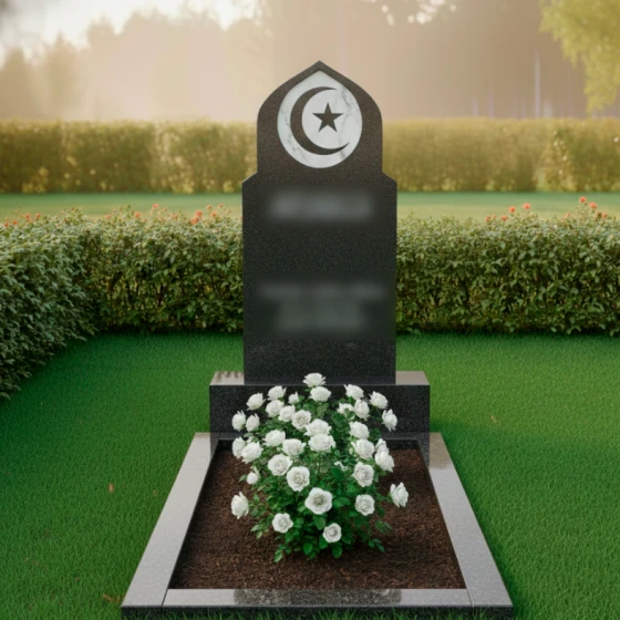 Данный мемориальный ансамбль представляет собой истинное воплощение благородства и духовной глубины. Величественная стела, выполненная в форме традиционного восточного купола или стрельчатой арки, сразу приковывает взгляд своей безупречной геометрией. Главным художественным акцентом композиции является искусно интегрированный медальон из белоснежного мрамора, расположенный в верхней части обелиска. В центре этого светлого круга филигранно вырезаны символы веры — полумесяц и пятиконечная звезда. Контраст между глубоким темным цветом основного камня и матовой чистотой мраморной вставки создает эффект небесного свечения, подчеркивая торжественность и значимость момента памяти. Плавные, но при этом строгие линии резьбы по контуру стелы свидетельствуют о высочайшем уровне камнерезного мастерства, превращая холодный камень в одухотворенное изваяние.