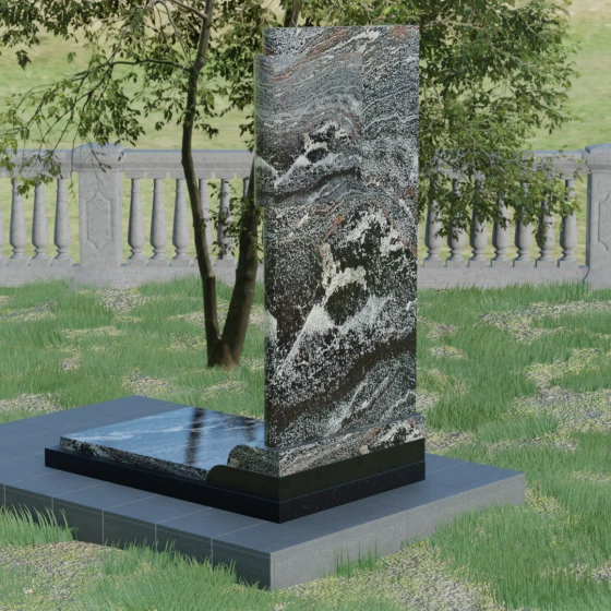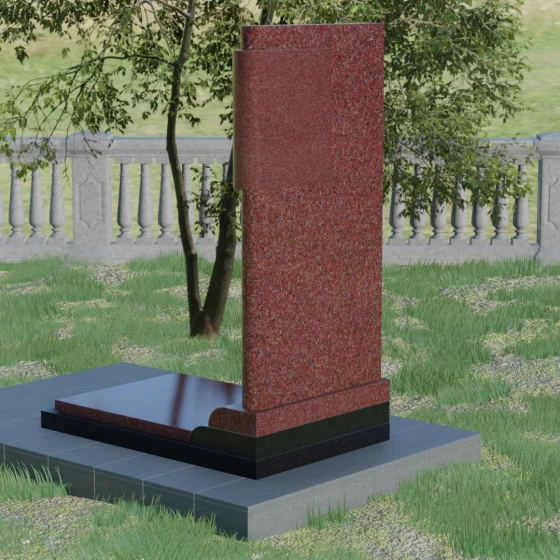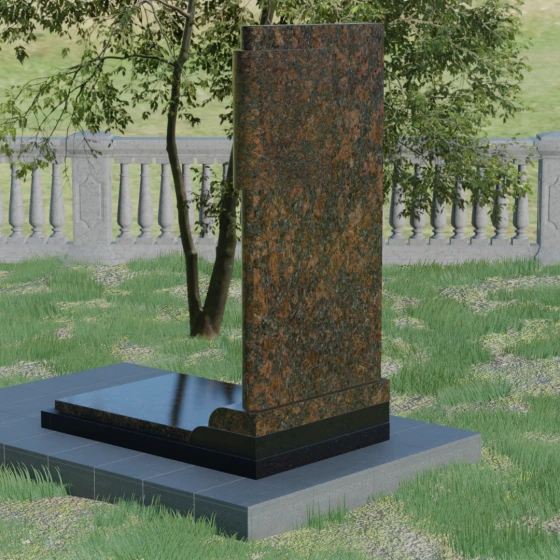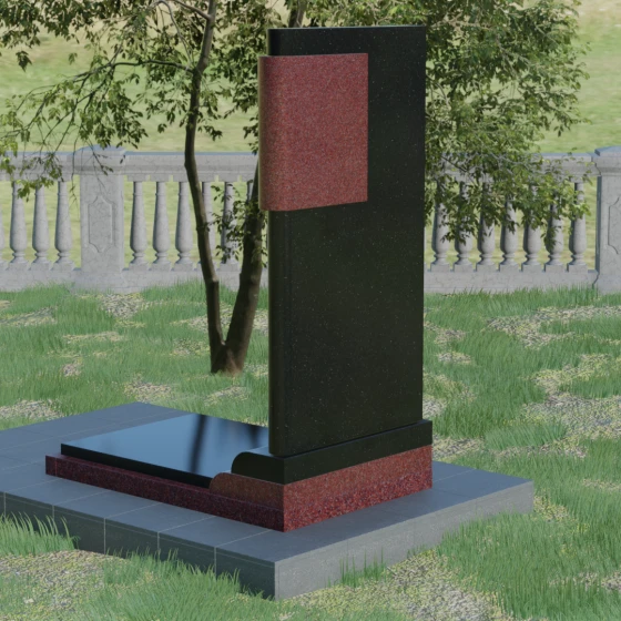 Геометрия модели продумана до мелочей: левая сторона стелы дополнена асимметричным вертикальным элементом с многоступенчатым завершением. Эта "ступенчатость" придает конструкции динамику и современный вид, выделяя её среди традиционных прямоугольных форм. Особое значение имеет сочетание фактур: идеально гладкая, зеркальная полировка основной части стелы эффектно контрастирует с шероховатой, тактильно приятной поверхностью боковых элементов. Зеркальный блеск гранита не только подчеркивает глубину цвета, но и защищает камень от внешних воздействий, позволяя мемориалу сохранять первозданный вид на протяжении столетий.