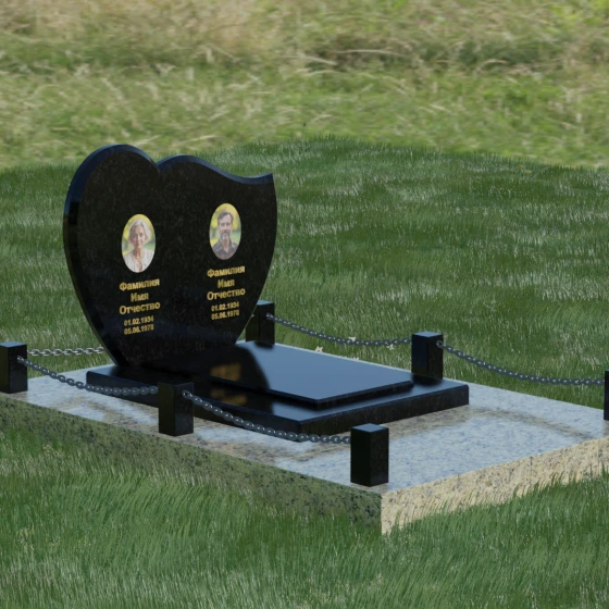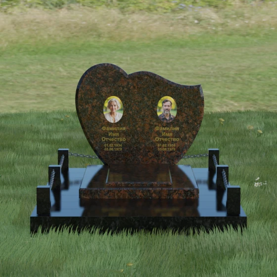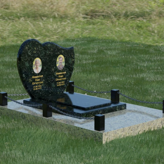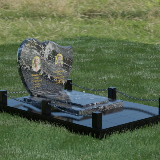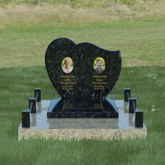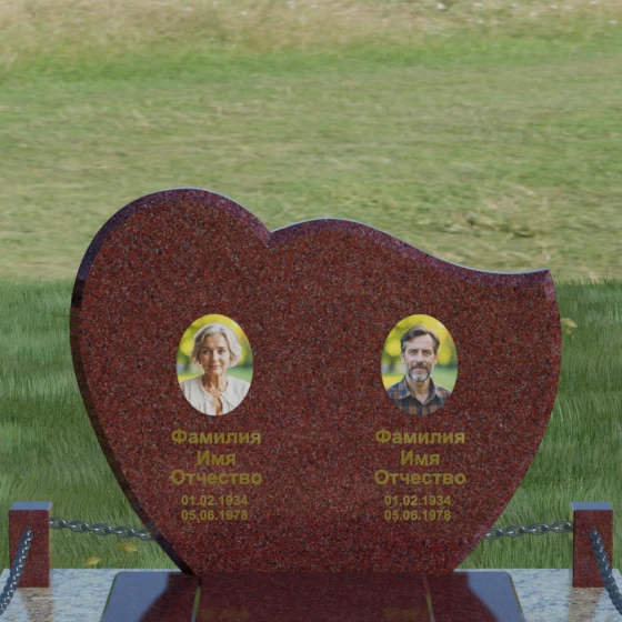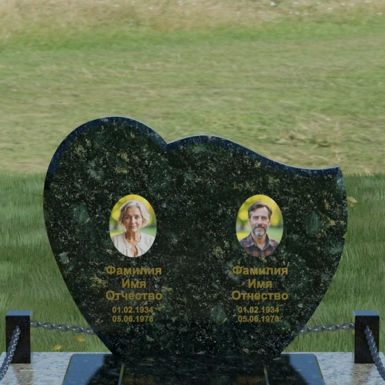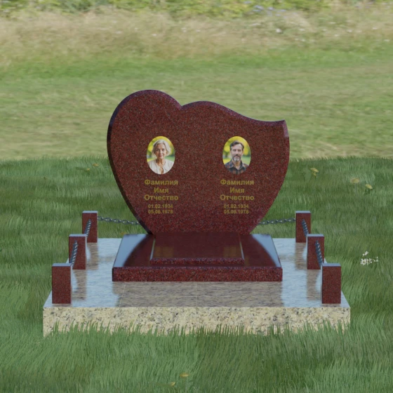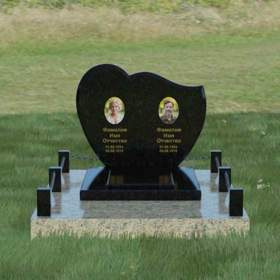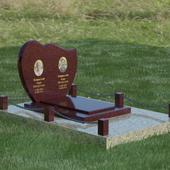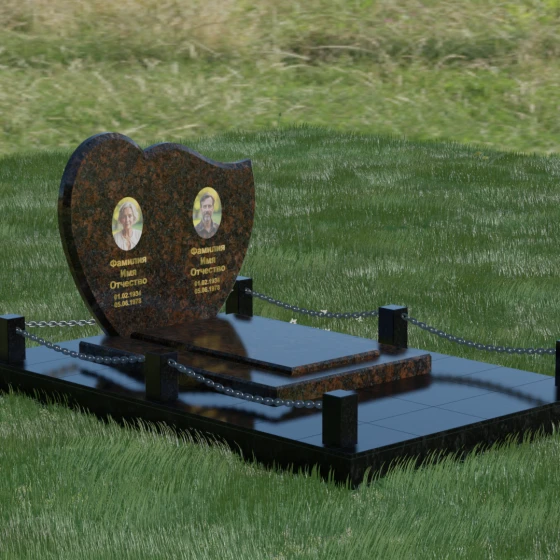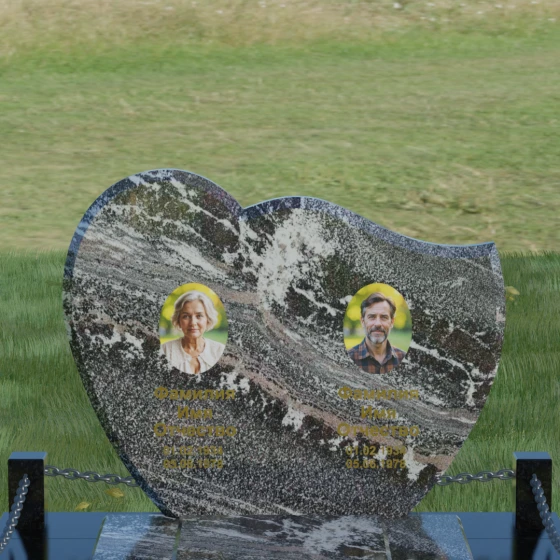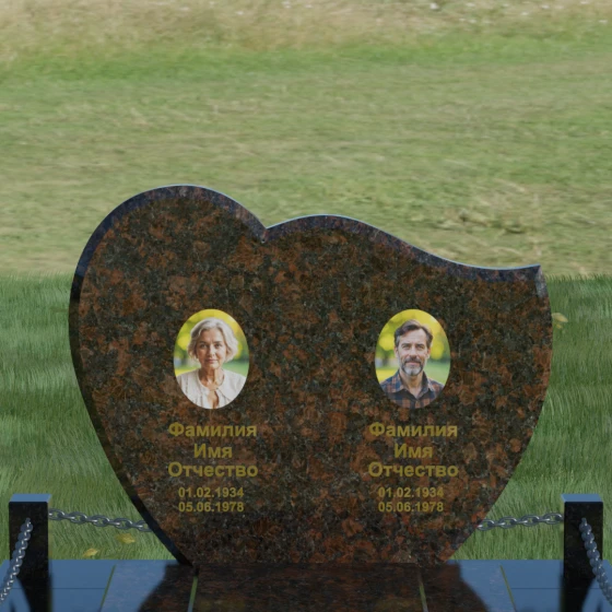 Выбор мемориала для двоих — это всегда стремление выразить неразрывную связь между близкими людьми и почтить их общую историю. Данная модель выполнена в форме стилизованного сердца, разделенного плавной, изящной линией на две органичные доли. Такая архитектурная форма символизирует единство душ, любовь и вечную привязанность. Горизонтальная ориентация стелы позволяет гармонично и сбалансировано разместить портреты и эпитафии, не перегружая композицию лишними деталями. Надгробие из натурального камня с его мягкими изгибами и безупречной зеркальной полировкой выглядит благородно и торжественно, становясь центральным элементом мемориального ансамбля. Отсутствие острых углов в верхней части конструкции придает монументу визуальную мягкость, подчеркивая нежность чувств к ушедшим.