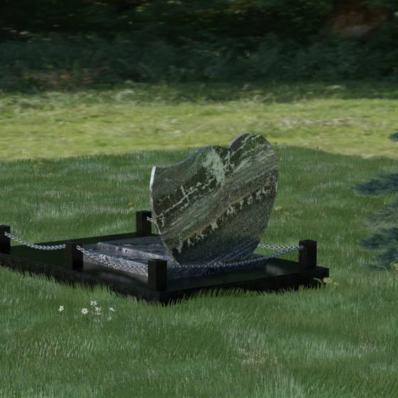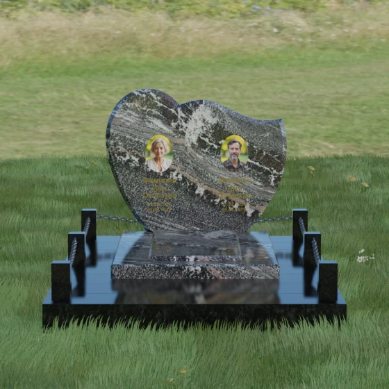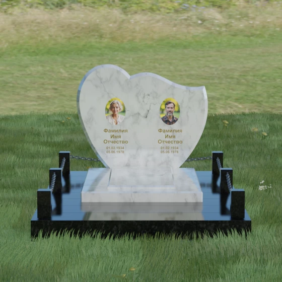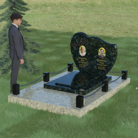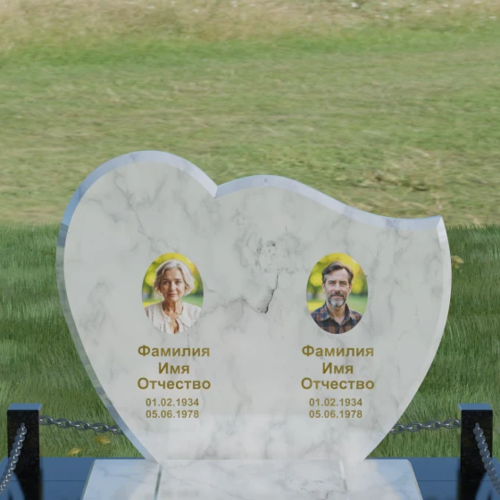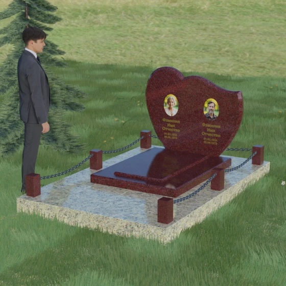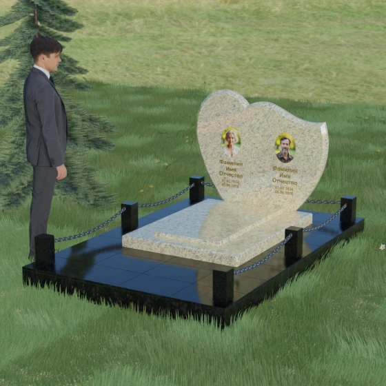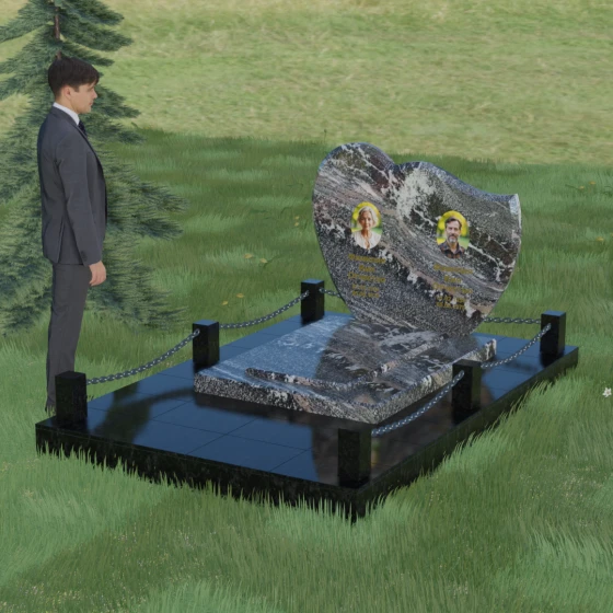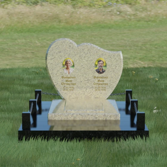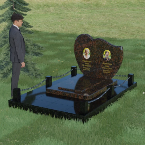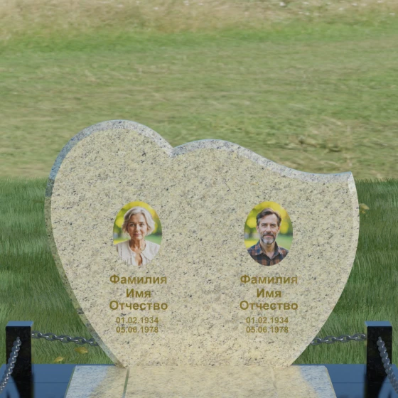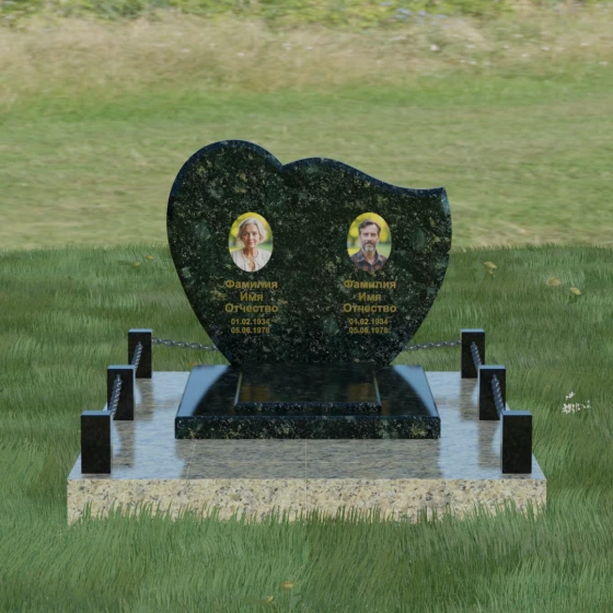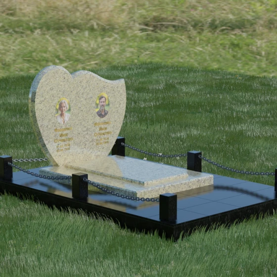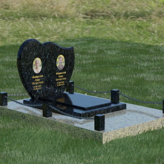 Выбор мемориала для двоих — это всегда стремление выразить неразрывную связь между близкими людьми и почтить их общую историю. Данная модель выполнена в форме стилизованного сердца, разделенного плавной, изящной линией на две органичные доли. Такая архитектурная форма символизирует единство душ, любовь и вечную привязанность. Горизонтальная ориентация стелы позволяет гармонично и сбалансировано разместить портреты и эпитафии, не перегружая композицию лишними деталями. Надгробие из натурального камня с его мягкими изгибами и безупречной зеркальной полировкой выглядит благородно и торжественно, становясь центральным элементом мемориального ансамбля. Отсутствие острых углов в верхней части конструкции придает монументу визуальную мягкость, подчеркивая нежность чувств к ушедшим.