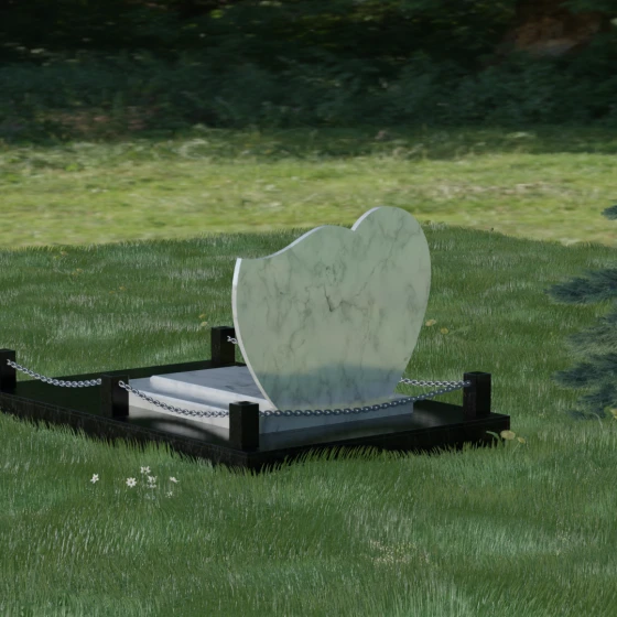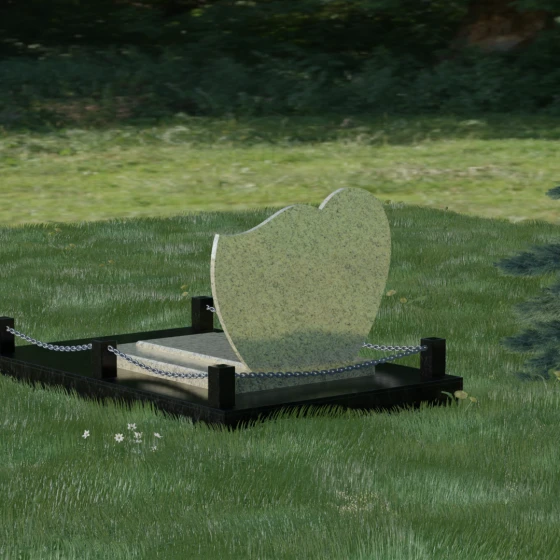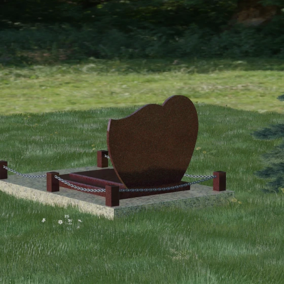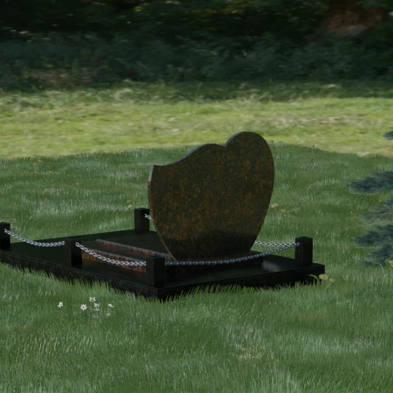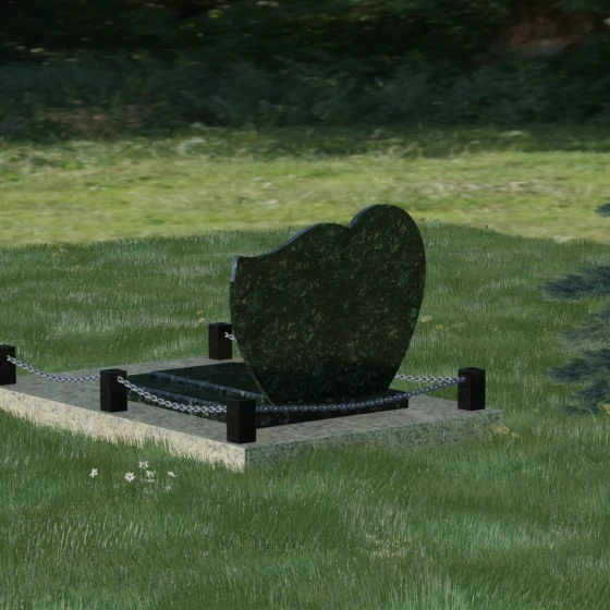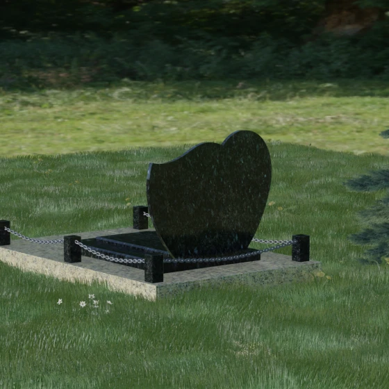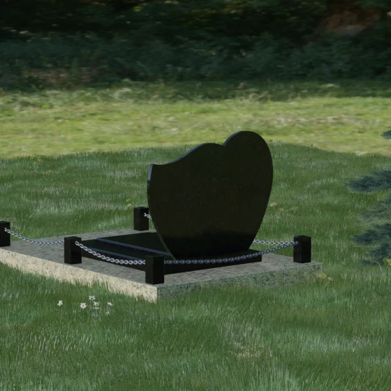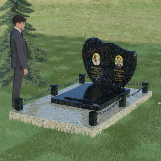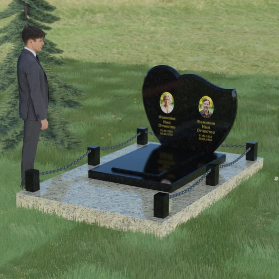 В данной модели акцент сделан на игре контрастов и чистоте форм. Лицевая сторона стелы проходит многоэтапную полировку, достигая глубокого зеркального блеска, на котором эффектно выделяются портреты и декоративные элементы. Архитектура комплекса включает в себя не только само изваяние, но и продуманное благоустройство территории. Массивная надгробная плита, выполненная в единой стилистике с основным монументом, полностью перекрывает участок. Это создает эстетически завершенный вид и значительно упрощает уход за местом захоронения, избавляя от необходимости борьбы с сорняками. Периметр мемориала обозначен строгими гранитными столбиками, соединенными декоративной металлической цепью. Такое решение создает четкие границы сакрального пространства, подчеркивая статус и защищенность мемориала.