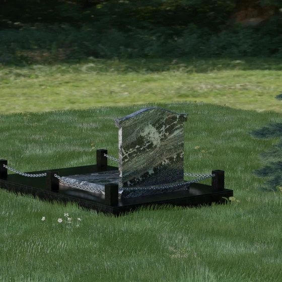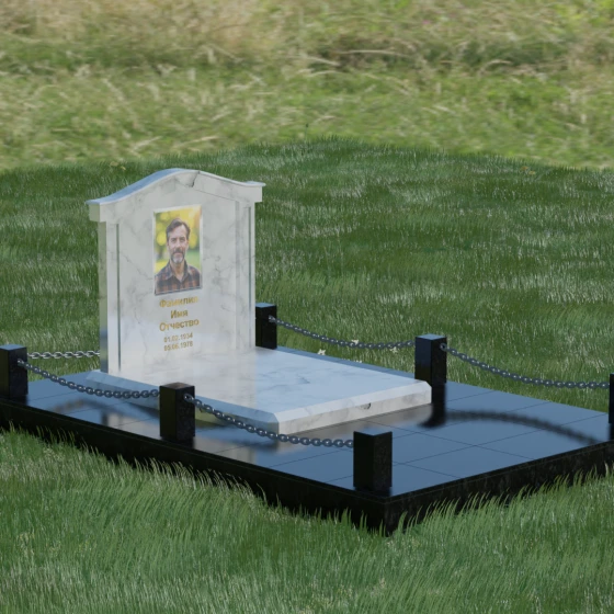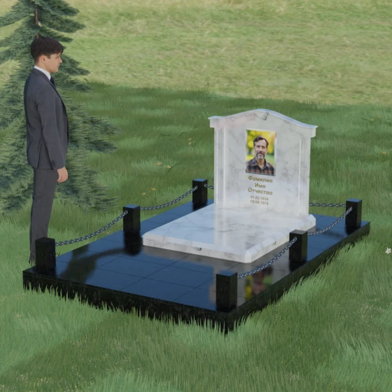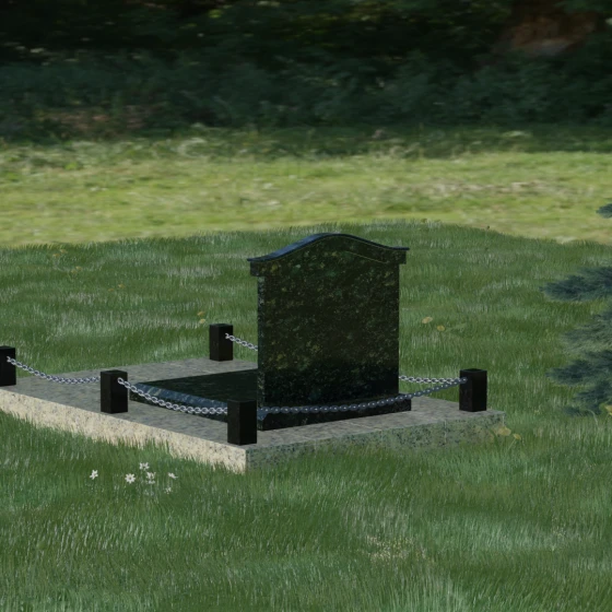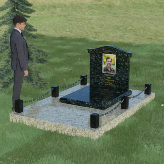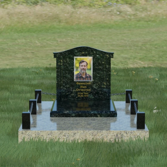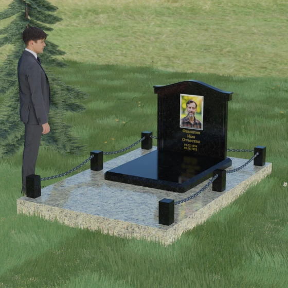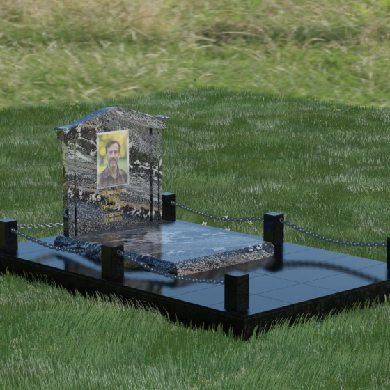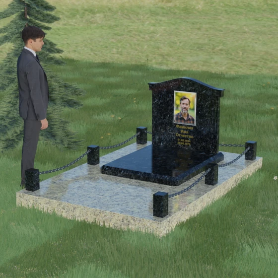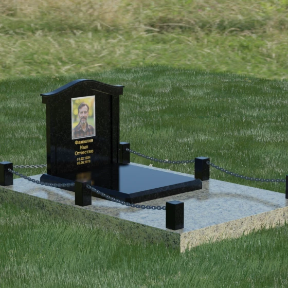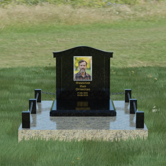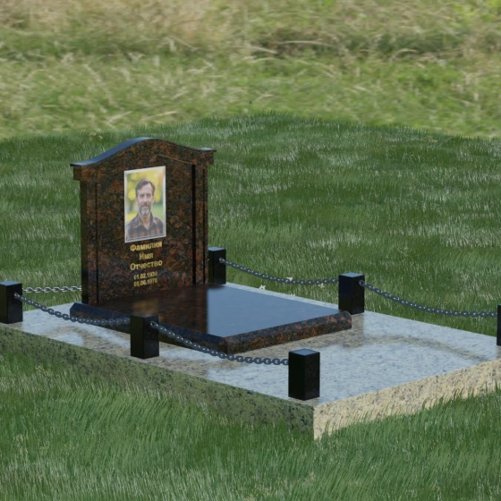 Данный ансамбль спроектирован как завершенная архитектурная форма, включающая в себя не только основную стелу, но и продуманную систему ограждения участка. Мемориальная композиция установлена на массивное основание, облицованное гранитными плитами. Такое решение не только придает эстетическую целостность, но и гарантирует долговечность конструкции, предотвращая проседание грунта и упрощая уход за территорией. По периметру расположены мощные каменные столбики (цоколи), соединенные декоративными цепями. Эти элементы создают четкую визуальную границу, подчеркивая приватность и сакральность места.