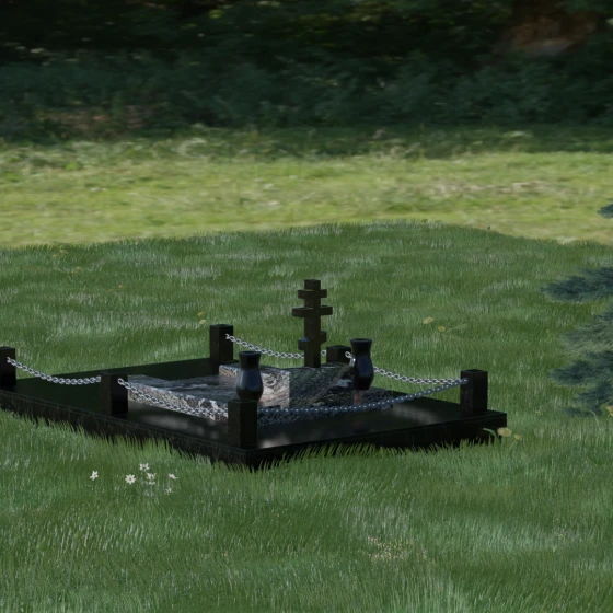 - Благоустройство: Комплектация включает гранитный цоколь по периметру, представленный строгими квадратными столбиками, соединенными декоративной металлической цепью.