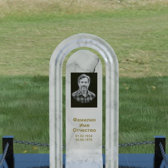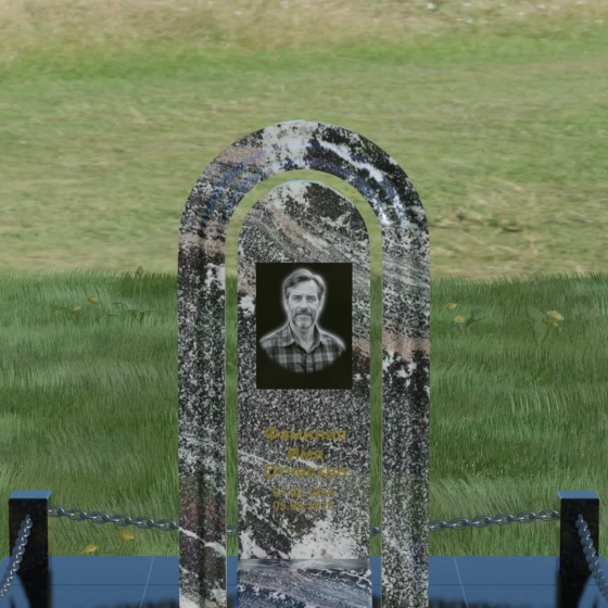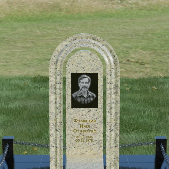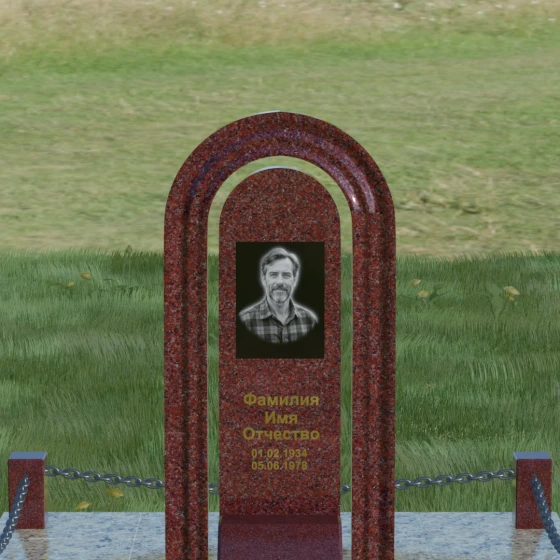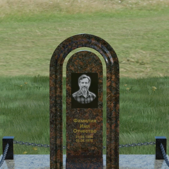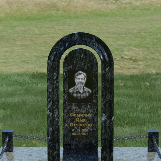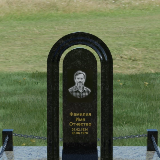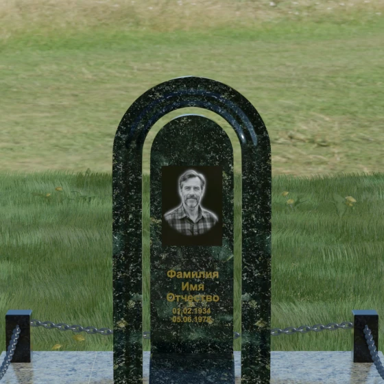 На широкой плоскости центральной стелы портрет располагается максимально гармонично, становясь смысловым центром композиции. Благодаря большой площади полированной поверхности, здесь достаточно места для нанесения не только имени и дат, но и эпитафии, выполненной сусальным золотом или глубокой гравировкой. Золотистые буквы на темном фоне гранита выглядят особенно торжественно, подчеркивая статус и значимость мемориала. Форма арки концентрирует взгляд на образе человека, создавая атмосферу тихого диалога между прошлым и настоящим.