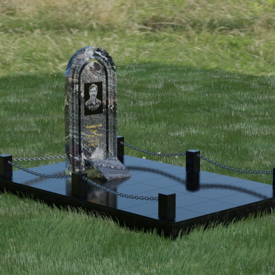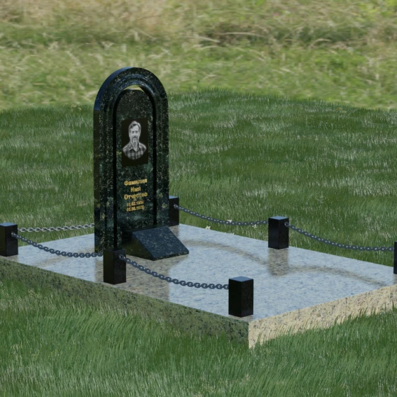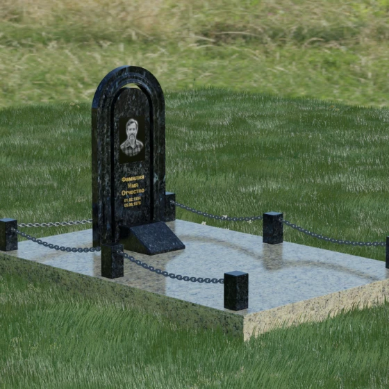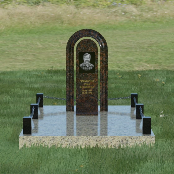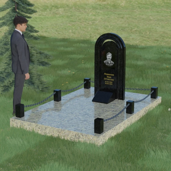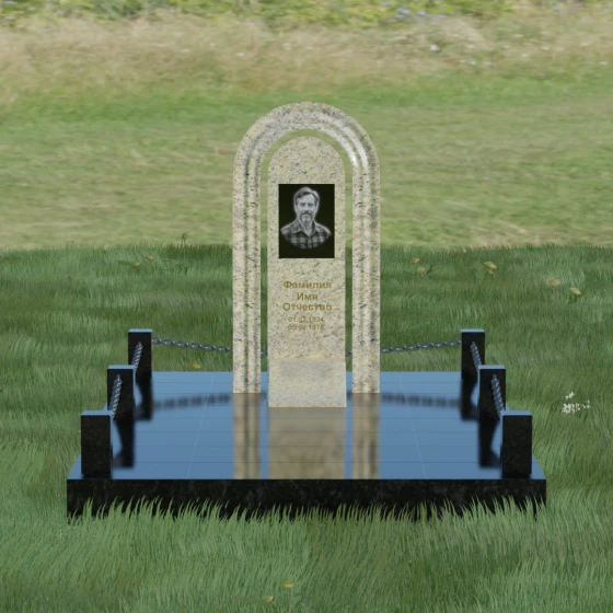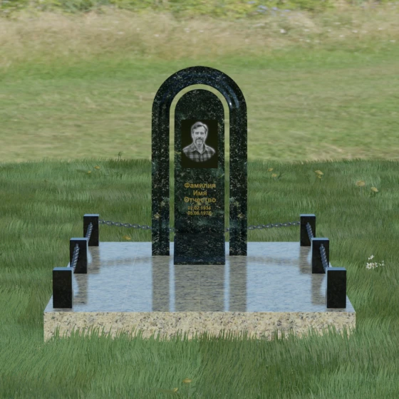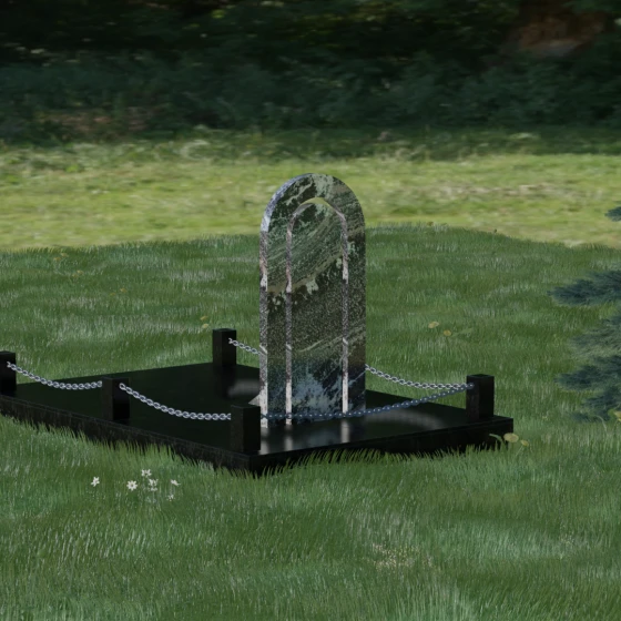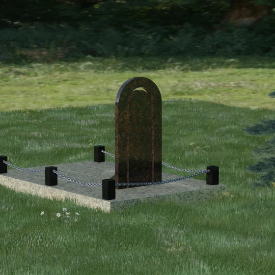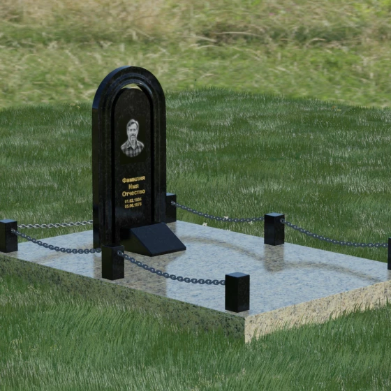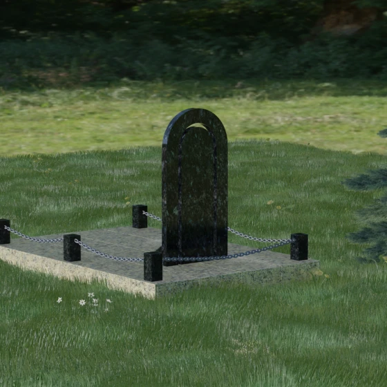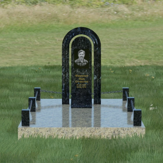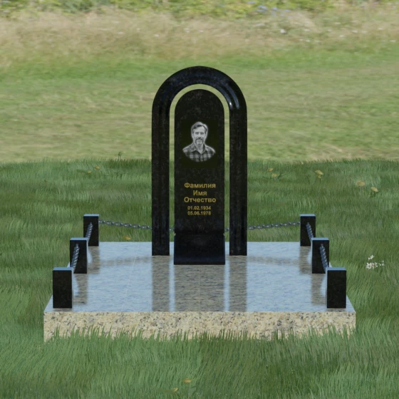 Эстетика этой модели строится на безупречной зеркальной полировке. Глубокий блеск камня отражает мир вокруг, визуально расширяя пространство и создавая игру света на изогнутых поверхностях. Особое внимание уделено благоустройству прилегающей территории: мемориал установлен на сплошную полированную плиту, полностью закрывающую участок. Это не только создает законченный и «дорогой» вид всей композиции, но и несет практическую пользу, исключая прорастание сорной травы и упрощая уход за местом памяти. По периметру установлены строгие квадратные столбики из натурального камня, соединенные массивными декоративными цепями. Такая ограда обозначает границы сакрального пространства, подчеркивая его обособленность и неприкосновенность, при этом не создавая ощущения тяжелой замкнутости.