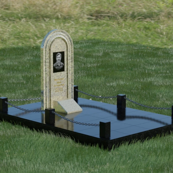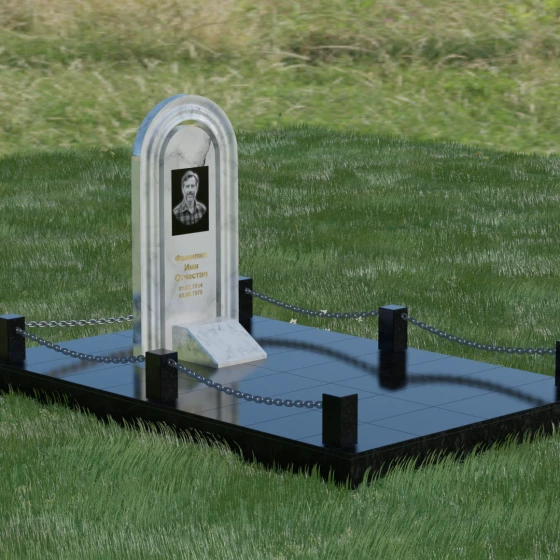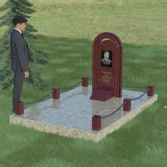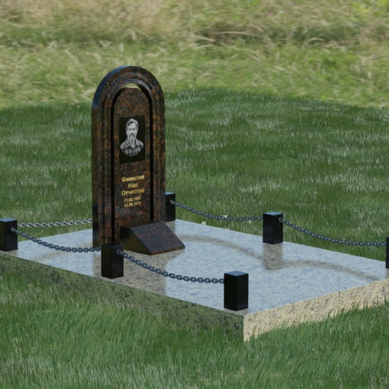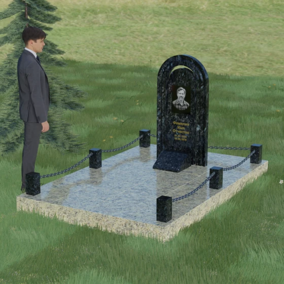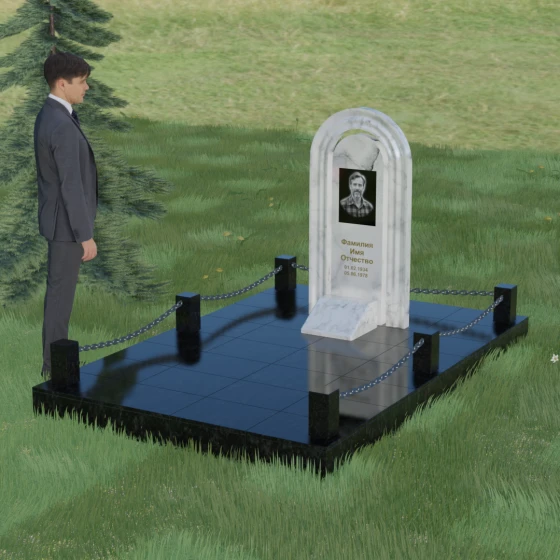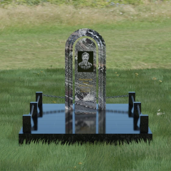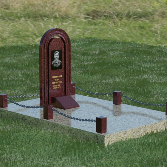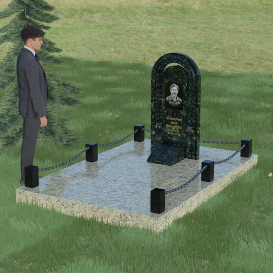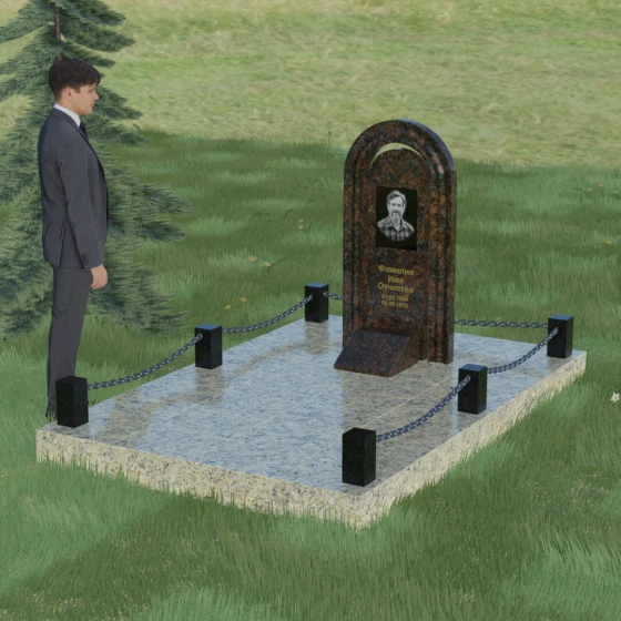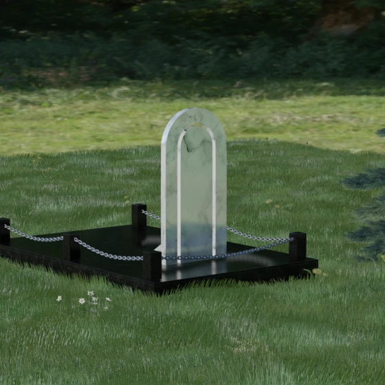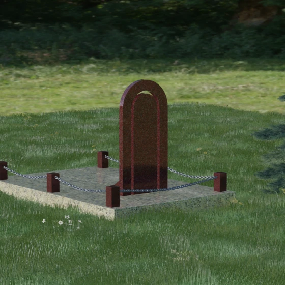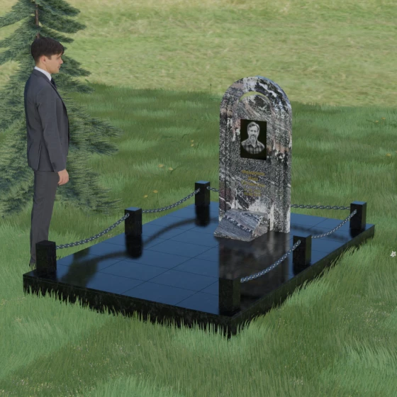 Эстетика этой модели строится на безупречной зеркальной полировке. Глубокий блеск камня отражает мир вокруг, визуально расширяя пространство и создавая игру света на изогнутых поверхностях. Особое внимание уделено благоустройству прилегающей территории: мемориал установлен на сплошную полированную плиту, полностью закрывающую участок. Это не только создает законченный и «дорогой» вид всей композиции, но и несет практическую пользу, исключая прорастание сорной травы и упрощая уход за местом памяти. По периметру установлены строгие квадратные столбики из натурального камня, соединенные массивными декоративными цепями. Такая ограда обозначает границы сакрального пространства, подчеркивая его обособленность и неприкосновенность, при этом не создавая ощущения тяжелой замкнутости.