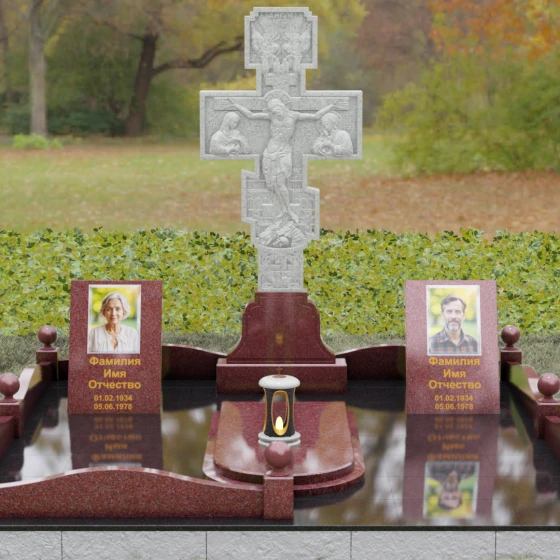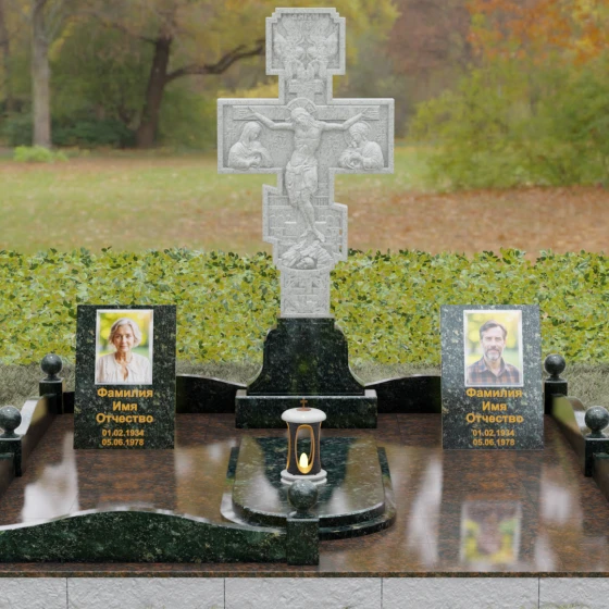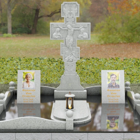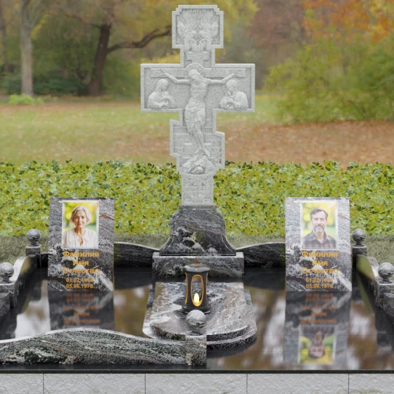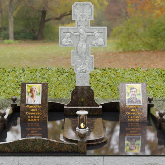 Боковые вертикальные элементы идеально подходят для размещения портретов. Будь то классическая гравировка, сохраняющая четкость линий на века, или современные фотокерамические вставки в золоченом обрамлении — форма стел позволяет расположить информацию максимально гармонично и читаемо. Продуманная архитектура комплекса позволяет объединить память о двух людях, создав единое пространство любви и скорби, которое станет достойным символом вечной памяти для будущих поколений.