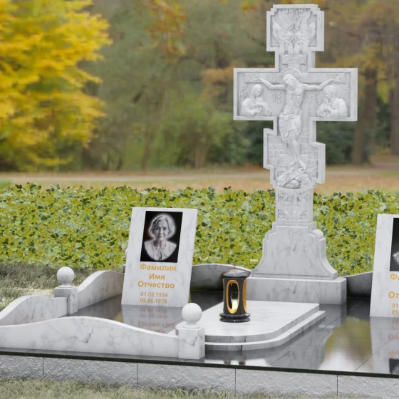 Данный мемориальный ансамбль представляет собой совершенный баланс между духовными традициями и современной архитектурной эстетикой. В центре композиции находится величественная стела в форме высокого православного креста, украшенного детальной многоуровневой резьбой. Барельефное изображение Распятия, выполненное с глубокой проработкой каждой детали — от складок плащаницы до ликов предстоящих, — создает ощущение покоя и благодати. Светлая, матовая фактура резного камня эффектно контрастирует с зеркально отполированными боковыми элементами, предназначенными для увековечивания памяти близких.