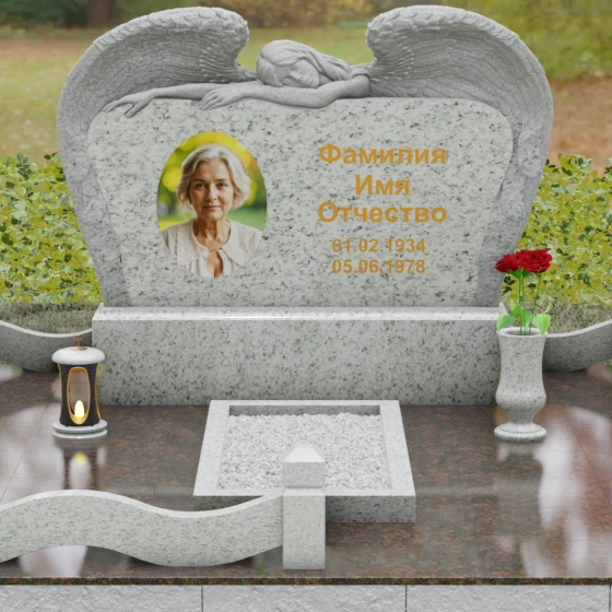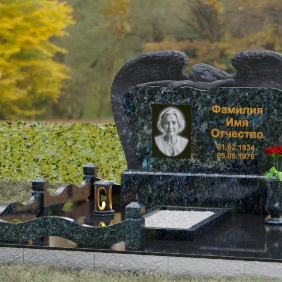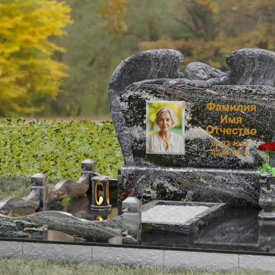 Представленный мемориальный комплекс (Артикул 130) является подлинным шедевром современной ритуальной архитектуры. Это не просто знак памяти, а монументальное художественное произведение, в котором гармонично сплелись суровая прочность природного камня и хрупкая нежность скульптурной пластики. Центральное место в композиции занимает величественная стела, выполненная в уникальном комбинированном стиле. Глубокий, антрацитово-черный массив основной плиты с безупречной зеркальной полировкой служит идеальным холстом для мемориальной гравировки. Его обрамляет искусно вырезанная из светлого камня фигура скорбящего ангела. Мастер добился поразительной детализации: вы можете видеть каждое перышко на мощных, распростертых крыльях, которые словно защищают покой ушедшего человека. Контраст между матовой, фактурной поверхностью резных элементов и глянцевым блеском основного камня создает невероятную визуальную глубину.