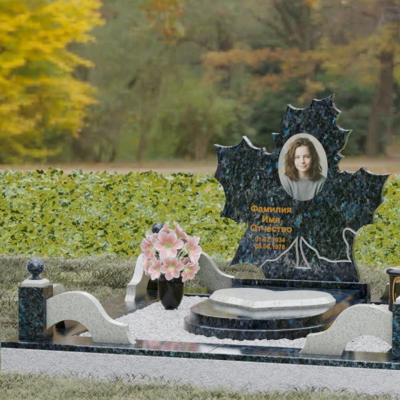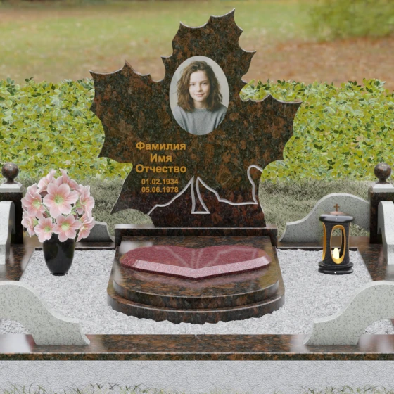 Данная мемориальная композиция — это воплощение глубокого уважения и вечной памяти, облаченное в художественную форму. Выбор формы кленового листа не случаен: в мировой символике он олицетворяет силу духа, красоту жизненного пути и мудрость. Каждая линия этой стелы пропитана эстетикой природного изящества. Резные края листа выполнены с филигранной точностью, создавая сложный, многогранный силуэт, который выделяется на фоне классических строгих форм. Плавные изгибы и отсутствие агрессивных углов призваны дарить чувство покоя и умиротворения, подчеркивая, что душа близкого человека обрела вечный приют в гармонии.