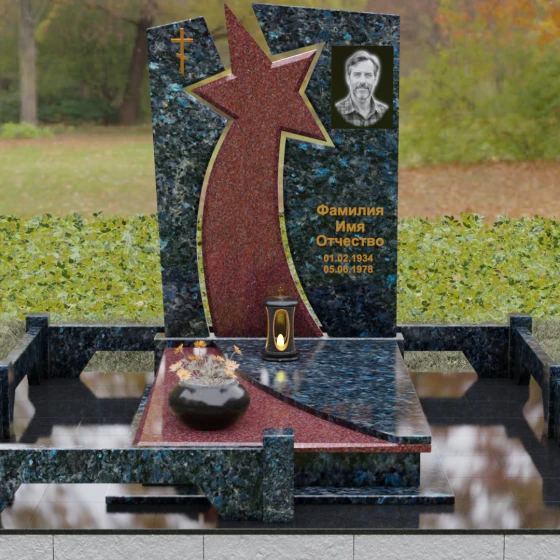 Форма этого мемориала наполнена глубокими смыслами. Центральный символ — звезда — традиционно олицетворяет путеводный свет, высокие достижения и бессмертие души. Для тех, чья жизнь была связана со служением отечеству, этот элемент подчеркивает их доблесть и профессиональный путь. В сочетании с православным крестом композиция говорит о единстве земного подвига и духовного упокоения. Плавные, дугообразные линии, обрамляющие центральную вставку, символизируют непрерывность времени и защиту, которую обретает душа в вечности. Асимметричная верхушка стелы подчеркивает индивидуальность и неповторимость жизненного пути человека.
