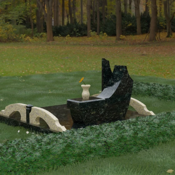 Особого внимания заслуживает комплексное благоустройство участка, входящее в концепцию данного мемориала. Вместо привычного открытого грунта здесь используется сплошное мощение массивными плитами, что обеспечивает не только величественный вид, но и исключительную чистоту: сорняки и грязь больше не будут беспокоить место памяти. По краям площадки установлены уникальные декоративные элементы — стилизованные каменные мостики или арки из светлого гранита, которые выступают в роли изящных ограничителей пространства. Завершает ансамбль точеная ваза из натурального камня, расположенная на специальном выступе основного изваяния, что создает единую, неразрывную художественную линию.