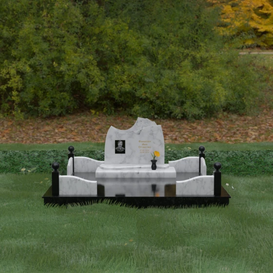• Декоративное ограждение: По периметру установлены невысокие бордюры из светлого камня с изящными изгибами, которые перекликаются с формой основной стелы.