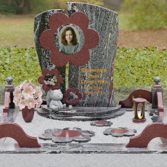 Представленный мемориальный ансамбль (Артикул 241) — это не просто памятник, а подлинное художественное произведение, в котором застыла нежность и вечная весна. В центре композиции находится величественная стела, выполненная в уникальной комбинированной технике. Ее асимметричная форма с деликатным вертикальным разделением создает динамичный и в то же время гармоничный силуэт. Главным акцентом является искусно вырезанный из камня цветок, в сердцевину которого помещен портрет. Плавные, округлые лепестки символизируют чистоту и хрупкость жизни, а их объемная фактура создает удивительную игру света и тени, контрастируя с глубокой зеркальной полировкой основного полотна стелы.