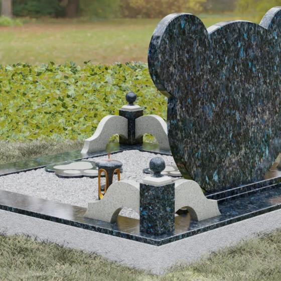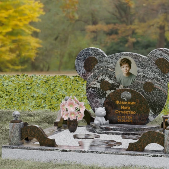 Эта мемориальная композиция представляет собой уникальный художественный проект, созданный для того, чтобы выразить бесконечную нежность и светлую печаль. Главная стела выполнена в форме головы медвежонка — символа чистоты, детства и вечного сна. Плавные, округлые линии силуэта лишены острых углов, что придает изделию визуальную мягкость и умиротворение. Мастера-камнерезы виртуозно передали геометрию образа: симметричные ушки со светлыми вставками и выразительные круглые глаза, созданные методом инкрустации камня другого оттенка. Игра контрастов между глубоким темным основанием и светлым матовым срезом декоративных элементов создает эффект живого объема, заставляя свет играть на полированных гранях и подчеркивая безупречную пластику камня.