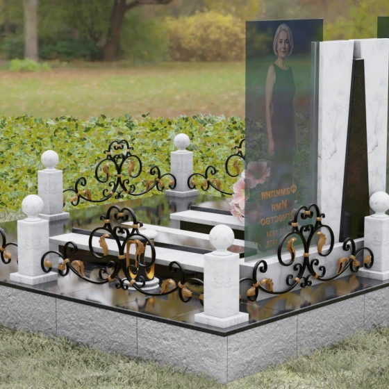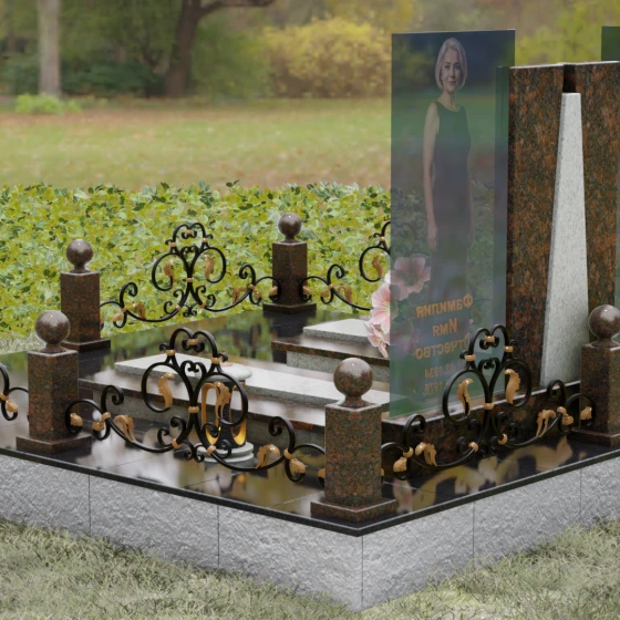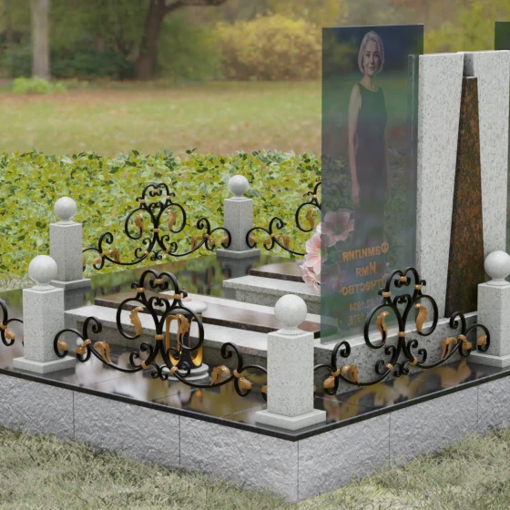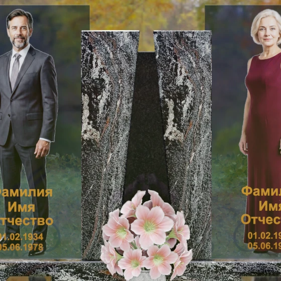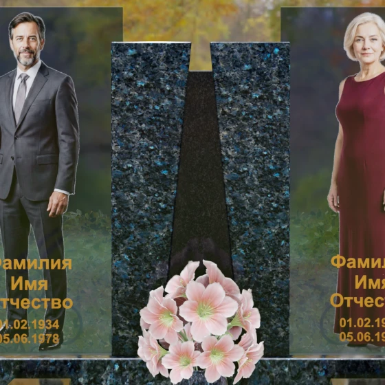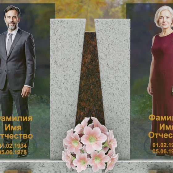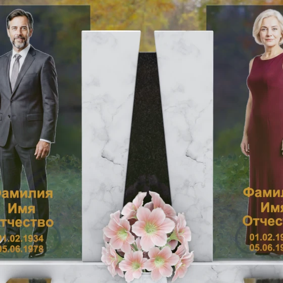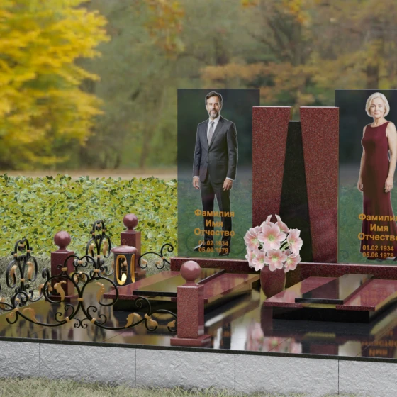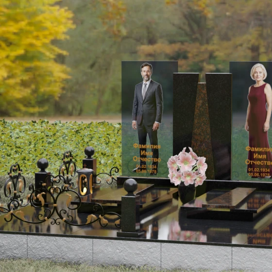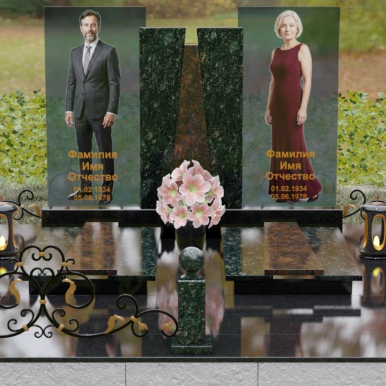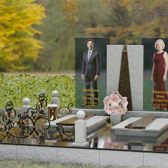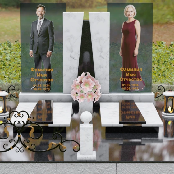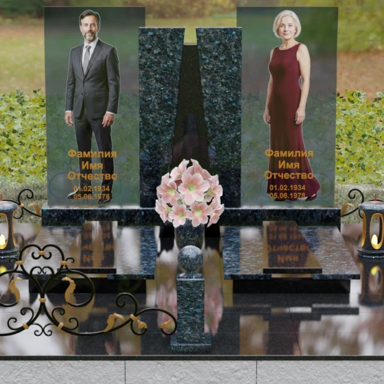 Кому подойдет: Эта монументальная композиция разработана для семейного захоронения двух человек (супругов, родителей). Она станет идеальным выбором для тех, кто ищет современное, статусное решение в стиле модерн, где классическая надежность гранита сочетается с художественной легкостью стеклянных элементов. Благодаря возможности выбора цвета камня, модель универсальна: в светлом исполнении (мрамор Тассо или Мансуровский гранит) она выглядит возвышенно и легко, а в темных тонах Габбро или Лезниковского гранита приобретает черты величественного склепа.