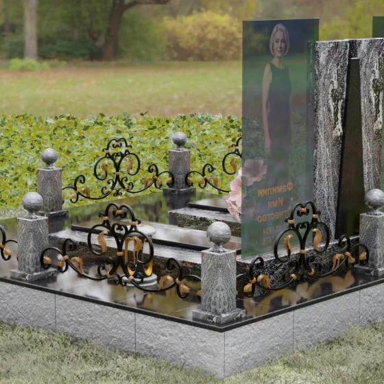 Центральным элементом ансамбля выступает трехсоставная стела, поражающая своей выверенной геометрией. В сердце композиции расположен массивный гранитный пилон, разделенный на две симметричные части клиновидной вставкой из контрастного камня. Этот «врез» создает мощный визуальный акцент, символизирующий светлую память, пробивающуюся сквозь толщу времени. По бокам от центрального монолита установлены высокотехнологичные панели из закаленного многослойного стекла. На них нанесены ростовые портреты, которые благодаря прозрачности материала кажутся объемными и живыми. Каждая грань камня проходит многоступенчатую обработку, достигая идеальной прямолинейности, что подчеркивает современный, «европейский» характер этого надгробного сооружения.