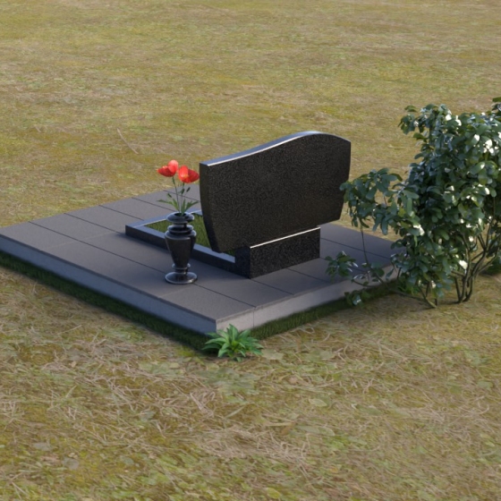 Форма стелы отличается лаконичностью, но при этом не лишена изысканности. Верхняя часть имеет мягкий, волнообразный изгиб, словно склоняясь в знак уважения и скорби. Прямоугольная подставка под стелой, выполненная в том же полированном граните, добавляет композиции завершенность и устойчивость. Дополнительная горизонтальная плита, расположенная на основании, создает пространство для возложения цветов и памятных вещей, позволяя выразить свою любовь и уважение.