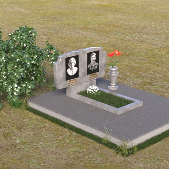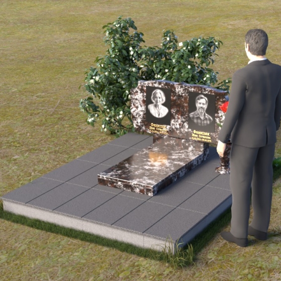 Композиция монумента строится на контрасте плавных линий и строгих геометрических форм. Верхняя часть, несущая на себе портреты усопших, имеет форму, напоминающую раскрытую книгу или свиток, где каждая страница хранит историю жизни. Края этого "свитка" искусно обработаны: верхняя грань словно оплавлена временем, приобретая мягкие, неровные очертания, а боковые стороны имеют более четкий, но все же сглаженный профиль. Фаска, идущая по периметру, придает верхней части визуальную легкость, отделяя ее от основания. Нижняя часть представляет собой прямоугольную плиту с зеркальной полировкой, отражающей небо и окружающий мир, создавая эффект бесконечности и связи с ушедшим. Она словно портал, соединяющий мир живых и мир мертвых, напоминая о непрерывности бытия. Боковины плиты имеют четкую геометрию, подчеркивая основательность и незыблемость памяти.