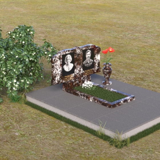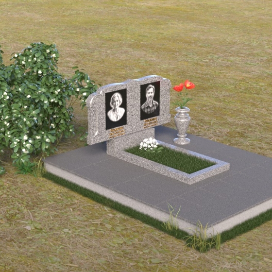 Эта мемориальная композиция состоит из основной стелы, подставки под нее и надгробной плиты. Стела имеет форму, близкую к прямоугольной, но с волнообразным, словно облака, верхним краем. Такая форма придает ей мягкость и умиротворение, избегая излишней строгости. На лицевой стороне стелы располагаются два портрета, выполненные с высокой точностью и детализацией. Под портретами выгравированы надписи, выполненные элегантным шрифтом. Справа от стелы расположена небольшая ваза из того же камня, предназначенная для живых или искусственных цветов, добавляющих композиции нотку жизни и тепла. Надгробная плита имеет прямоугольную форму с полированной поверхностью, отражающей небо и окружающий мир, словно зеркало памяти. Все элементы установлены на прочное основание, облицованное серыми плитами.