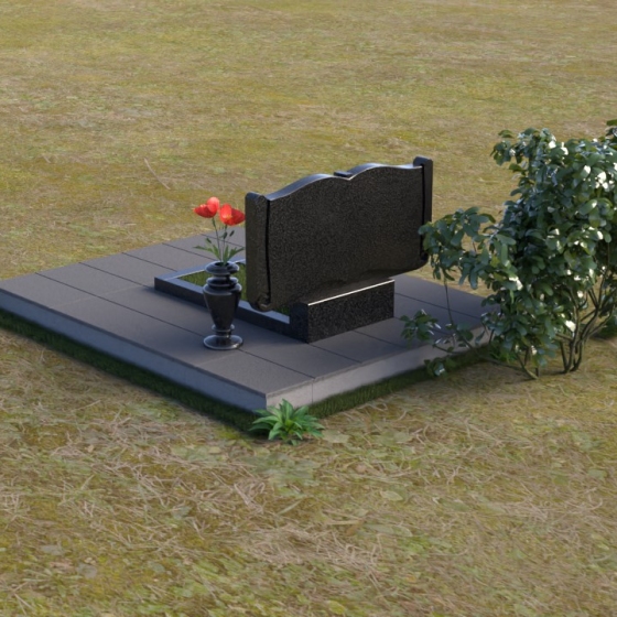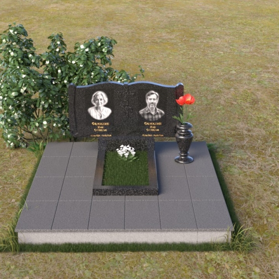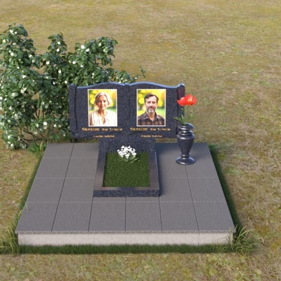 Ритуальное изделие ПГ036 представляет собой сдержанную, но исполненную достоинства композицию, созданную для сохранения памяти о близких. Два прямоугольных элемента стелы, соединенные вместе, образуют волнистый верх, напоминающий раскрытую книгу судеб. Грани обеих частей искусно обработаны, создавая мягкий, обтекаемый силуэт. Зеркальная полировка черного гранита служит идеальным фоном для гравировки портретов и надписей, словно запечатлевая светлые воспоминания в вечном камне. Слева и справа, в верхней части стелы, вырезаны лаконичные кресты, символизирующие веру и надежду. Тонкие линии врезаются в полированную поверхность, создавая игру света и тени, и добавляя глубину изображению. Горизонтальная плита, расположенная перед стелой, выполнена из того же черного гранита с зеркальной полировкой, отражая небо и окружающий пейзаж, создавая ощущение легкости и воздушности. Вместе с тем, основание памятника выполнено из серого камня, что придает всей композиции устойчивость и основательность.