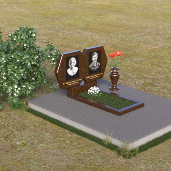 Этот памятник – пример элегантной простоты и сдержанного величия. Величественная стела состоит из двух симметричных частей, соединенных в верхней точке, образуя гармоничный и цельный образ. Верхняя часть каждой стелы имеет форму, близкую к шестиугольнику, с аккуратно скошенными углами, придающими ей мягкость и благородство. Боковые грани обеих частей стелы тщательно отполированы до зеркального блеска, что создает потрясающую игру света и тени, подчеркивая глубину и объем камня. Фаски, снятые по периметру, добавляют скульптурности и изящества. Нижняя часть стелы, где располагаются имена и даты, выполнена в строгой прямоугольной форме, что создает визуальный контраст с более сложной верхней частью и акцентирует внимание на надписях. Вся композиция установлена на массивной горизонтальной плите, также выполненной из полированного гранита, что придает памятнику устойчивость и основательность.