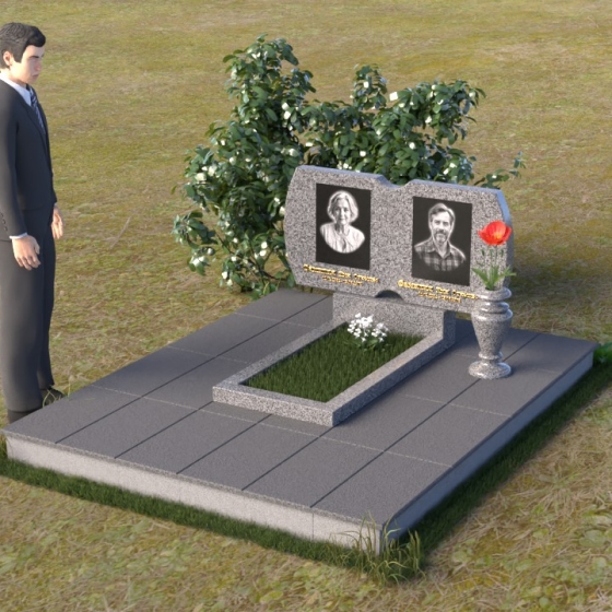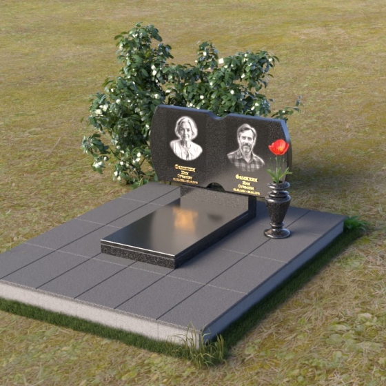 Этот гранитный монумент воплощает в себе строгость и элегантность, создавая достойное обрамление памяти. Лаконичная форма верхней плиты, сочетающая в себе плавные изгибы и прямые линии, словно рассказывает историю жизни, полную как светлых, так и трудных моментов. Зеркальная полировка черного гранита притягивает взгляд, отражая небо и окружающий мир, создавая ощущение глубины и вечности. Контраст полированной поверхности с выгравированными портретами создает эффект объемности и реалистичности, позволяя сохранить дорогие черты ушедших близких. Сдержанный дизайн памятника позволяет ему гармонично вписаться в любой ландшафт, не нарушая тишину и покой места упокоения.