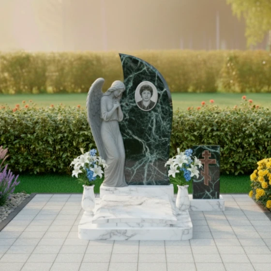 Этот мемориальный комплекс излучает тихую скорбь и надежду на небесное заступничество. Изогнутая форма стелы, словно крыло ангела, устремляется ввысь, символизируя вознесение души. Модель доступна в восьми вариантах исполнения - от строгого черного гранита до светлого мрамора Тассос - позволяя создать мемориал, наиболее точно отражающий личность усопшего и чувства близких.