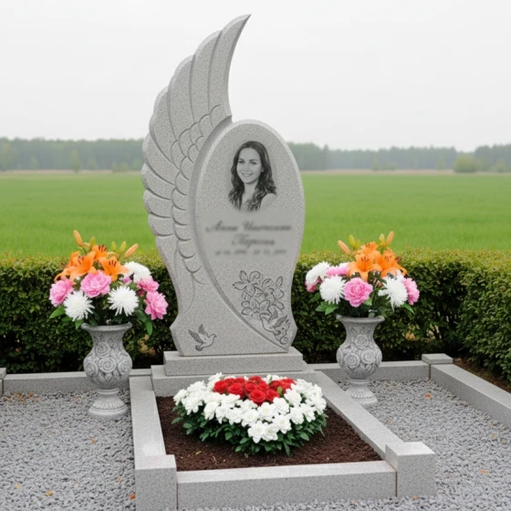 Центральным элементом комплекса является стела, выполненная в уникальной асимметричной форме, напоминающей распахнутое крыло ангела или взлетающую птицу, символизирующую вознесение души и безмятежный покой. Одна сторона стелы имеет строгую вертикальную линию, тогда как другая плавно изгибается вверх, создавая ощущение легкости и устремленности. Эта динамичная форма, лишенная острых углов, передает идею непрерывности жизненного пути и перехода в иное измерение. Грани стелы тщательно отполированы, что придает камню зеркальный блеск и глубину, в то время как внутренняя часть "крыла" украшена объемной резьбой, имитирующей перья. Эта резьба создает игру света и тени, подчеркивая естественную фактуру камня и придавая композиции дополнительный объем и выразительность. На лицевой стороне стелы, в верхней части, выгравирован овальный портрет, обрамленный тонкими линиями, а ниже — информация о покойном, выполненная изящным шрифтом. В нижней части стелы расположена гравировка двух летящих голубей — вечного символа мира, чистоты души и небесного покоя, что еще больше усиливает эмоциональное воздействие мемориала.