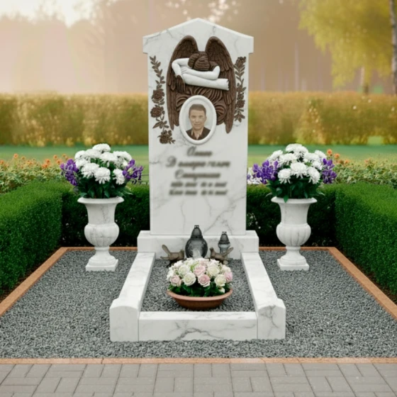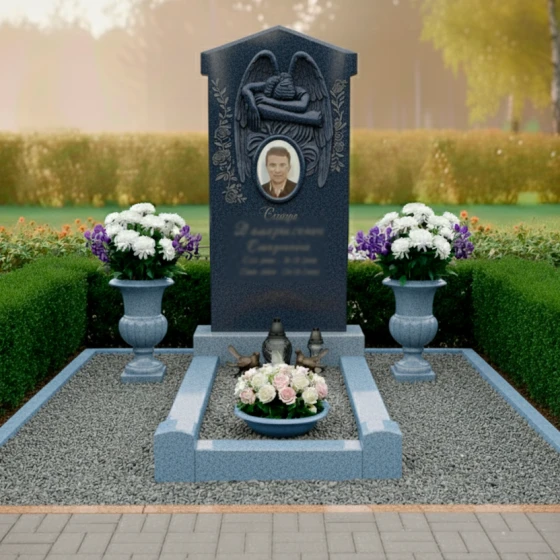 Эта мемориальная композиция отличается гармоничным сочетанием строгих линий и нежных, плавных изгибов, создающих ощущение умиротворения и вечного покоя. Центральным элементом является высокая, величественная стела, выполненная в форме прямоугольника с изящно скругленными верхними углами, что придает ей мягкость и утонченность. Верхняя часть стелы украшена объемным барельефом в виде распростертых крыльев ангела, бережно обнимающих пространство над портретом усопшего. Каждое перо крыльев тщательно проработано, создавая игру света и тени на матовой, бархатистой поверхности камня, в то время как основное поле стелы имеет глубокую, зеркальную полировку, отражающую небо и окружающий мир. В центре композиции, под крыльями, расположено овальное обрамление для фотографии, словно окошко в светлое прошлое, а под ним — гравировка имени и дат, выполненная с особой аккуратностью и почтением.