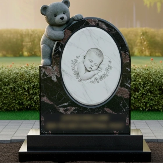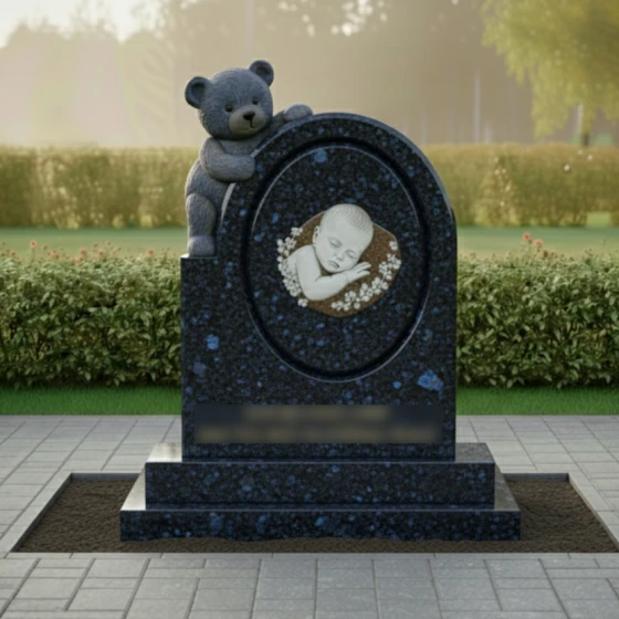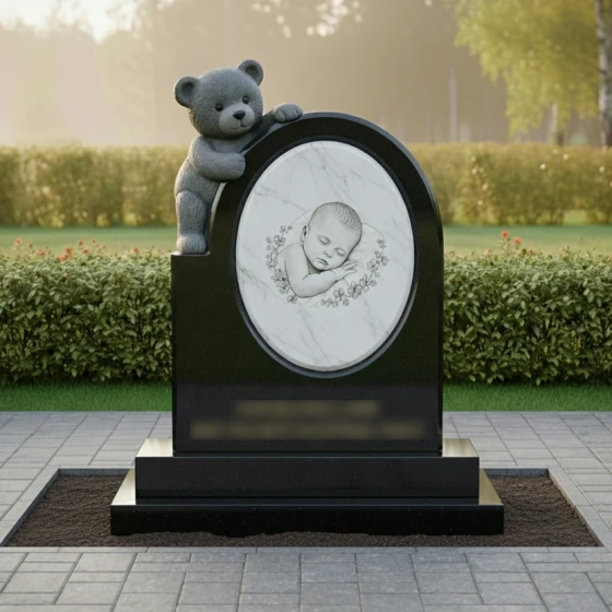 Центральным элементом композиции является уникальная объемная резьба в виде плюшевого медвежонка, который бережно обнимает основное вертикальное полотно памятника. Медведь выполнен с поразительной детализацией: мастера передали фактуру «шерсти» и мягкие складки, создавая ощущение тепла и защиты. Этот образ — символ верного стража детского сна, вечного спутника, который остается рядом, когда слова становятся излишними. Фигура медведя контрастирует с идеально гладкой, зеркальной поверхностью основного камня, создавая сложную игру света и тени.