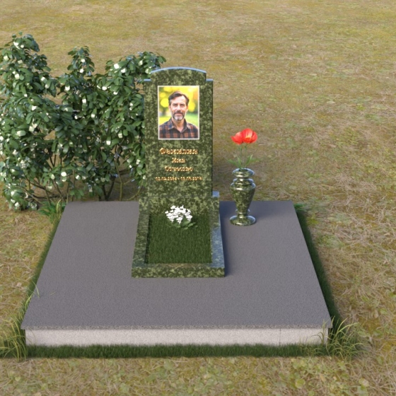Основной акцент в этой модели сделан на контрасте фактур. Зеркальная полировка черного гранита Габбро-диабаз, из которого выполнена стела, создает эффект бесконечности, отражая небо и окружающий мир. На этом фоне особенно выразительно смотрится гравировка портрета и надписи, выполненные с ювелирной точностью. Нижняя часть стелы, переходящая в горизонтальную плиту, также выполнена из черного гранита, но уже с матовой обработкой, что придает композиции дополнительную глубину и текстуру. Рядом располагается ваза из того же гранита, выполненная в классическом стиле, предназначенная для живых цветов, которые станут символом памяти и любви.