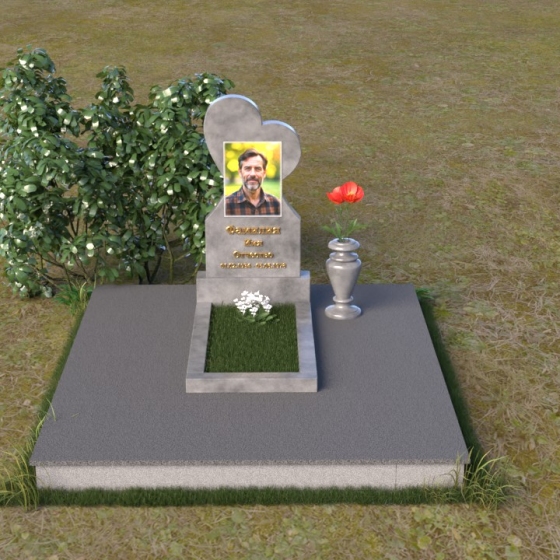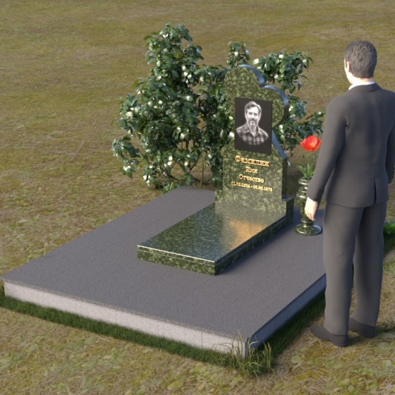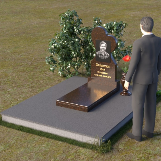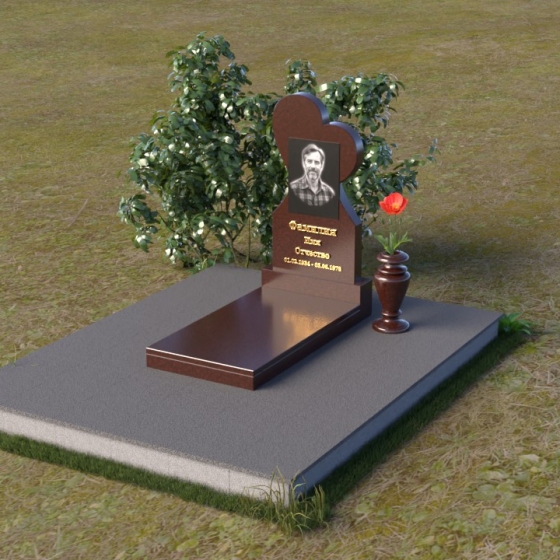 Этот памятник представляет собой изысканное сочетание строгих линий и плавных изгибов, создающее гармоничный и запоминающийся образ. Основная стела выполнена в форме сердца, что является традиционным символом любви и скорби. Верхняя часть сердца плавно переходит в более узкую часть, образуя своеобразный силуэт, устремленный ввысь. Грани стелы тщательно отполированы, что придает камню зеркальный блеск и подчеркивает его глубокий цвет. На лицевой стороне стелы располагается портрет усопшего, выполненный с высокой степенью детализации. Ниже портрета выгравированы имя, отчество и фамилия, а также даты рождения и смерти. Надписи выполнены изящным шрифтом, который придает памятнику благородный вид. Основание стелы выполнено в виде прямоугольной плиты, которая также тщательно отполирована. Плита служит надежной опорой для стелы и обеспечивает ее устойчивость. Фаски на плите аккуратно обработаны, что придает ей законченный вид.