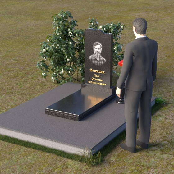 Надгробие начинается с массивного основания, выполненного в форме прямоугольной плиты. Его поверхность имеет матовую, слегка шероховатую фактуру, что создает контраст с глянцевыми элементами верхней части. На основании установлена горизонтальная плита, выполненная из полированного черного гранита. Зеркальная поверхность отражает небо и окружающий ландшафт, создавая ощущение глубины и простора. Вертикальная стела, расположенная в задней части композиции, является доминантой всего ансамбля. Ее верхняя часть имеет плавный, волнообразный изгиб, смягчающий строгие геометрические формы. На лицевой стороне стелы выгравирован портрет усопшего, а также имя, фамилия, отчество и даты жизни, выполненные золотистыми буквами. С правой стороны от стелы размещена небольшая гранитная ваза строгой формы, предназначенная для живых или искусственных цветов.
