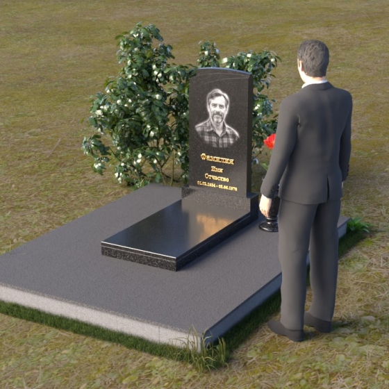 Основание мемориальной композиции – широкая плита, выполненная из камня с матовой фактурой. Ее цвет контрастирует с глянцевой поверхностью стелы и горизонтальной плиты, создавая визуальный интерес и подчеркивая строгость линий. Геометрия модели продумана до мелочей: от основания, надежно покоящегося на земле, до вертикальной стелы, устремленной ввысь. Плавные переходы между элементами композиции создают ощущение гармонии и завершенности.
