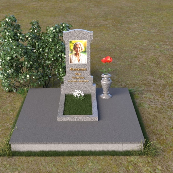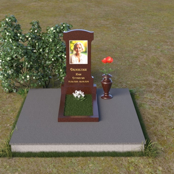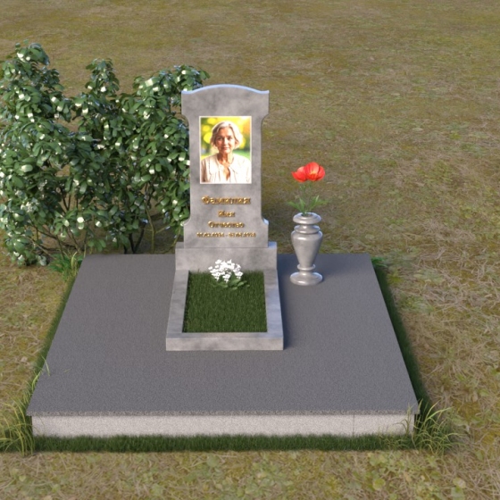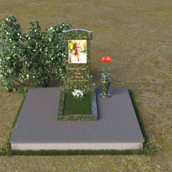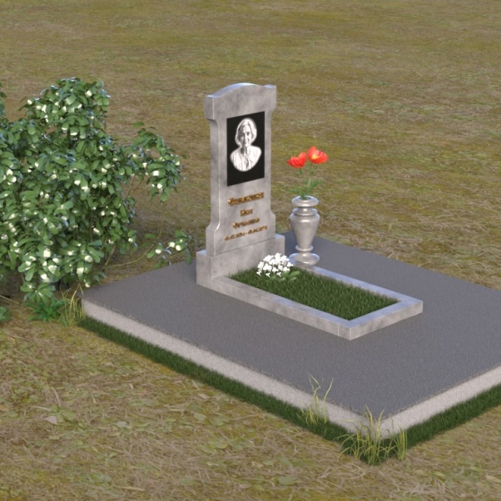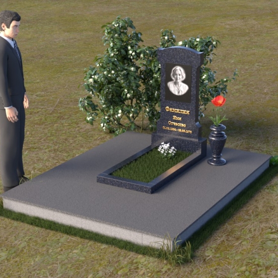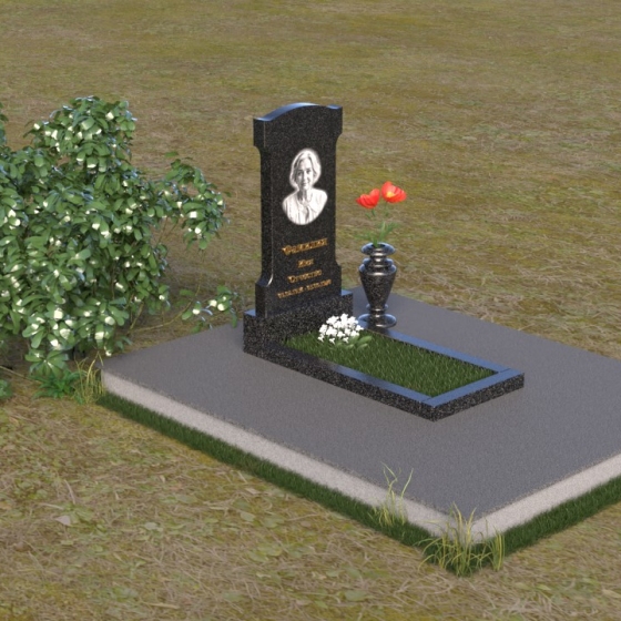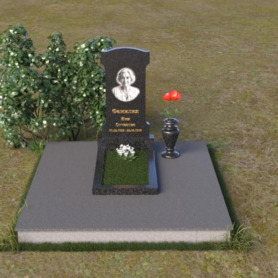 Эта мемориальная композиция отличается изысканной простотой и лаконичностью форм. Стела, возвышающаяся над местом упокоения, имеет строгую, но элегантную форму, близкую к прямоугольнику, с мягко скругленными верхними углами, придающими ей завершенный и гармоничный вид. Фасадная часть стелы тщательно отполирована до зеркального блеска, что позволяет максимально проявить глубину и насыщенность цвета камня. На этой гладкой, отражающей поверхности особенно выразительно выглядит гравировка портрета и надписи, выполненные с особой тщательностью. Боковые грани стелы имеют легкий скос, что придает ей визуальную легкость и изящество. Нижняя часть стелы переходит в горизонтальную плиту, также отполированную до зеркального блеска, создавая единый ансамбль. Основание, выполненное из серого камня с матовой фактурой, служит надежным фундаментом для всей композиции, подчеркивая ее монументальность и основательность.