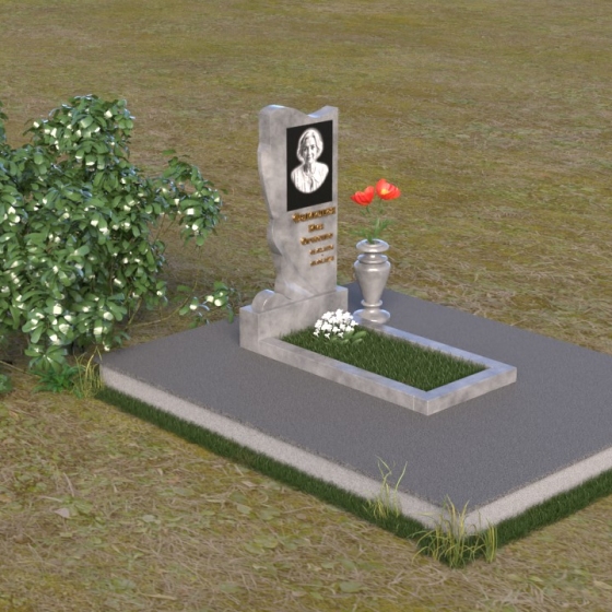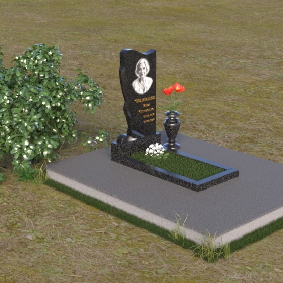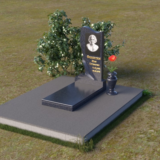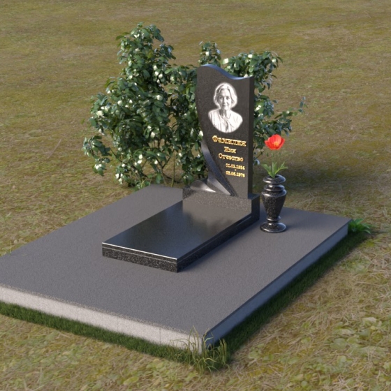 Стела памятника представляет собой элегантную вертикальную плиту с плавной, слегка асимметричной верхней частью. Эта форма придает изделию визуальную легкость и устремленность ввысь, символизируя духовное вознесение. Левая грань стелы украшена изящной резной деталью, напоминающей ниспадающую драпировку или крыло ангела. Этот элемент добавляет динамики и глубины композиции, создавая игру света и тени, которая подчеркивает мастерство исполнения. В верхней части стелы располагается портрет, выполненный с высокой степенью детализации. Ниже портрета выгравированы имя усопшего и даты жизни. Шрифты подобраны таким образом, чтобы обеспечить максимальную читаемость и гармонично вписываться в общий дизайн.
