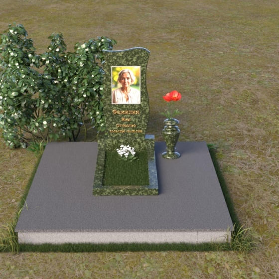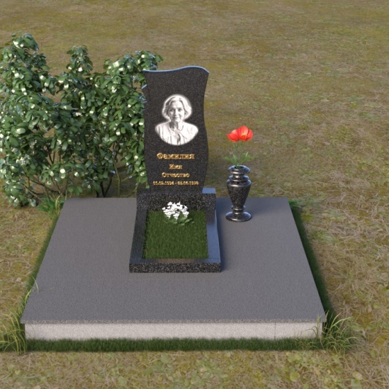 Нижняя часть стелы, переходящая в основание, выполнена в виде прямоугольного блока с зеркальной полировкой. Эта деталь создает эффект контраста между матовой верхней частью с гравировкой и глянцевой нижней, усиливая визуальное восприятие и привлекая внимание к портрету и надписи. Благодаря высококачественной полировке, поверхность камня отражает свет, создавая игру бликов и теней, что придает памятнику особую выразительность. Подставка под стелу, выполненная в виде горизонтальной плиты, обеспечивает устойчивость конструкции и служит дополнительным элементом дизайна.