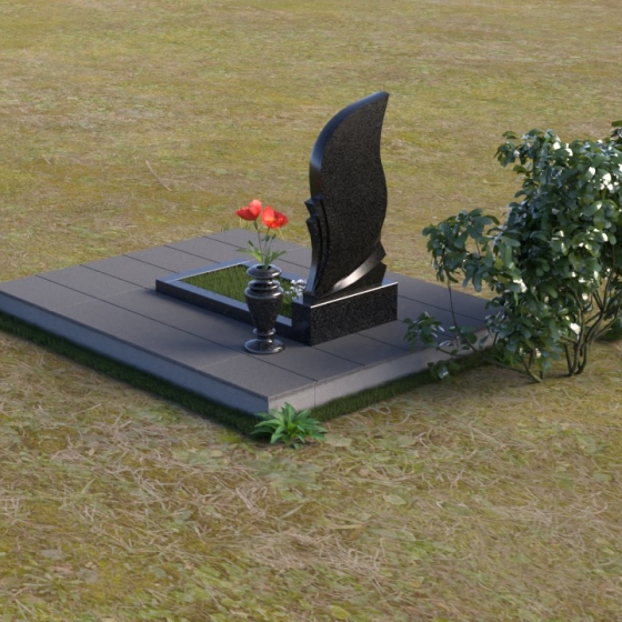 Начиная с основания, мы видим строгую геометрическую подставку, выполненную из того же материала, что и стела. Ее прямые углы и четкие линии создают ощущение стабильности и надежности. Далее взгляд переходит к полированной горизонтальной плите, на которой можно разместить цветы или другие памятные предметы. Сама стела, возвышаясь над плитой, представляет собой изящную дугу, словно застывшую в вечном поклоне. Ее левый край плавно переходит в тонкую линию, а правый – более массивный, украшенный деликатной резкой, имитирующей драпировку, придающую композиции легкость и воздушность. Эта асимметрия создает ощущение динамики и жизни, словно камень дышит и движется. На боковой грани стелы можно увидеть изящную вазу, предназначенную для живых цветов, которые станут символом неувядающей памяти.
