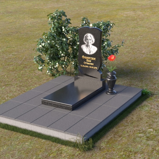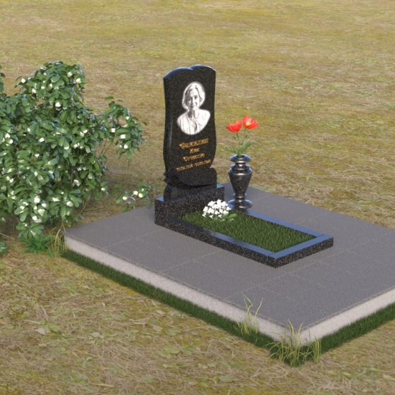 Основание мемориальной композиции – широкая горизонтальная плита, выполненная в строгом геометрическом стиле. На ней расположена дополнительная надгробная плита, отполированная до зеркального блеска. Черный гранит, отражая небо, создает эффект глубины и бесконечности, напоминая о вечности души. Рядом со стелой установлена ваза из того же гранита, предназначенная для живых цветов, символов любви и памяти.