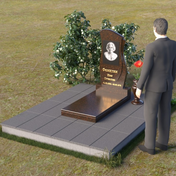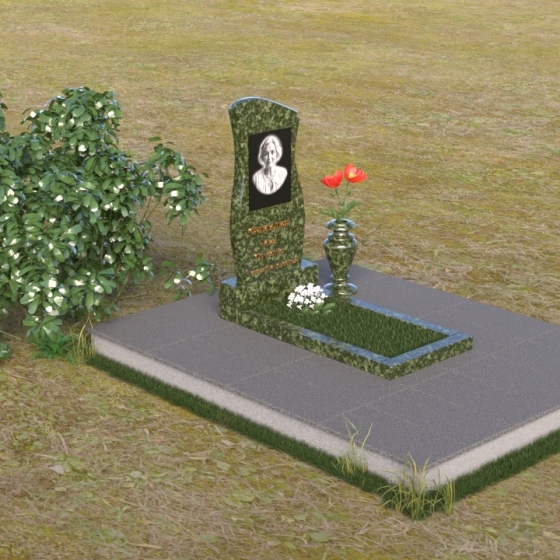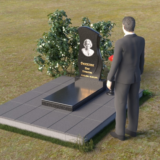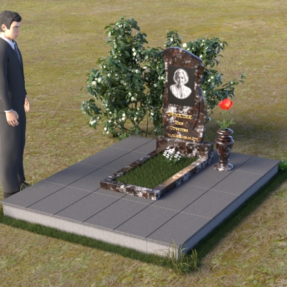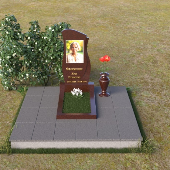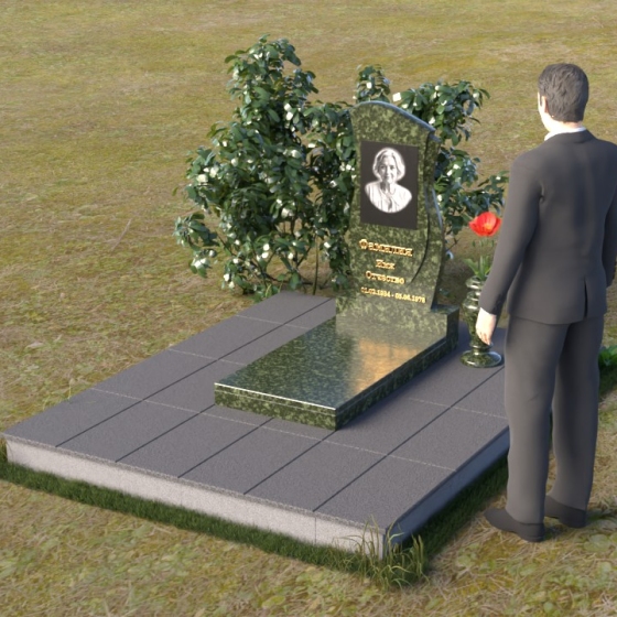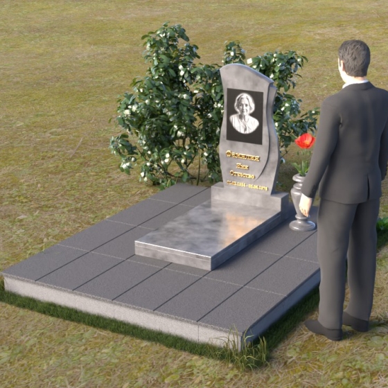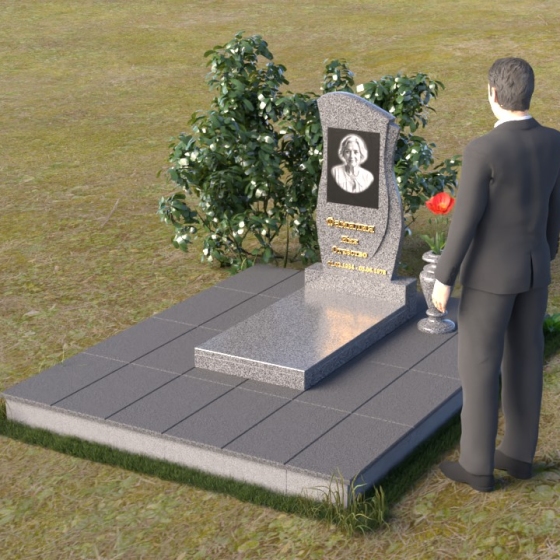Ниже портрета располагается изящная гравировка с именем и датами жизни усопшего, выполненная четким, легко читаемым шрифтом. Подставка под стелу выполнена в форме прямоугольной плиты с полированной верхней поверхностью, отражающей небо и окружающий пейзаж. Эта плита плавно переходит в горизонтальную надгробную плиту, создавая единую, гармоничную композицию. Ваза, установленная рядом со стелой, выполнена в том же стиле, что и памятник, и служит прекрасным дополнением к общей композиции.