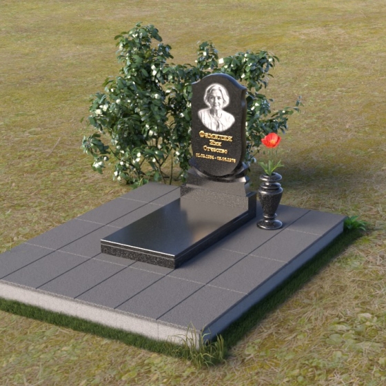 Этот гранитный монумент представляет собой композицию из двух основных элементов: вертикальной плиты с портретом и горизонтальной надгробной плиты, соединенных между собой. Форма вертикальной плиты напоминает собой изящную арку, верхняя часть которой плавно закруглена, словно стремясь ввысь. Лицевая поверхность отполирована до зеркального блеска, что позволяет четко видеть выгравированный портрет и надпись. По краям арки проходит легкий фацет, придающий монументу завершенный и утонченный вид. Плавные, скругленные линии создают ощущение мягкости и умиротворения, символизируя покой и вечность.