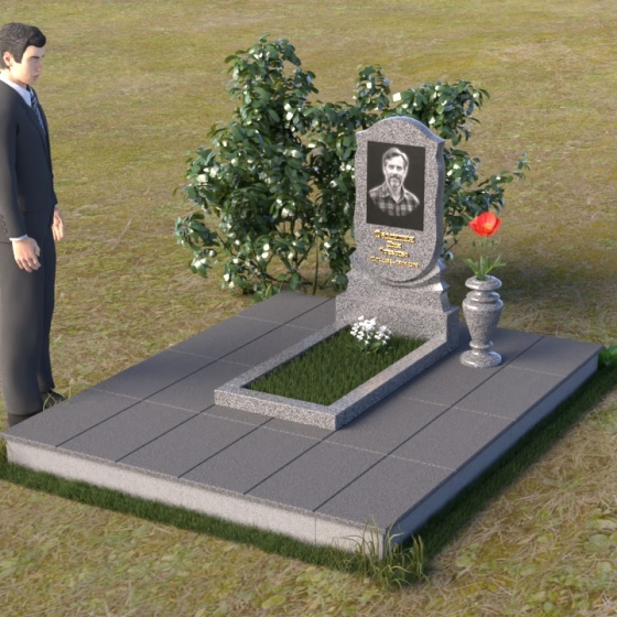 Горизонтальная плита, расположенная ниже, имеет строгую прямоугольную форму с четкими гранями. Ее поверхность также отполирована до зеркального блеска, создавая эффект отражения окружающего мира. Это символизирует связь между миром живых и миром ушедших, напоминая о том, что память о человеке остается в наших сердцах навсегда. В правой части композиции присутствует небольшая гранитная ваза, выполненная в классическом стиле. Ее форма, с плавными переходами и тонкими линиями, гармонично дополняет общий облик памятника.