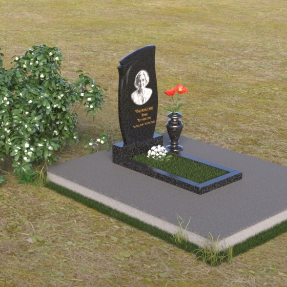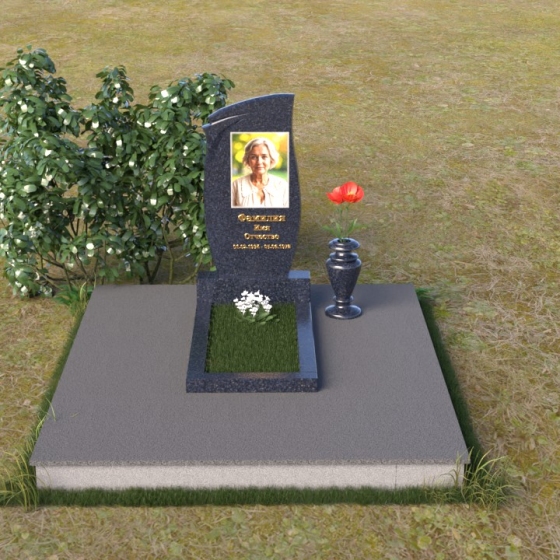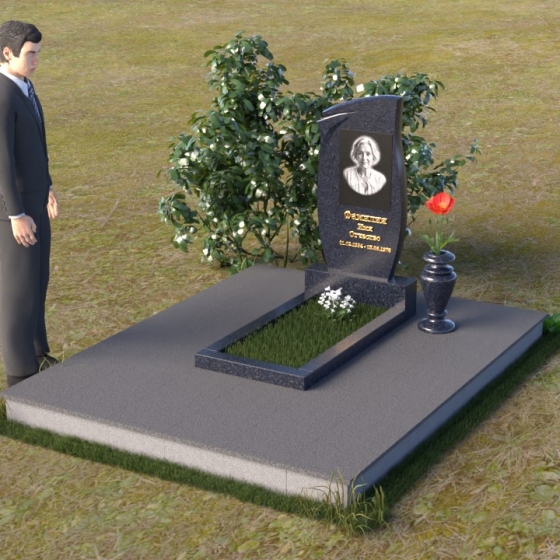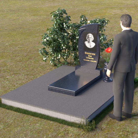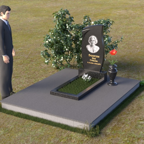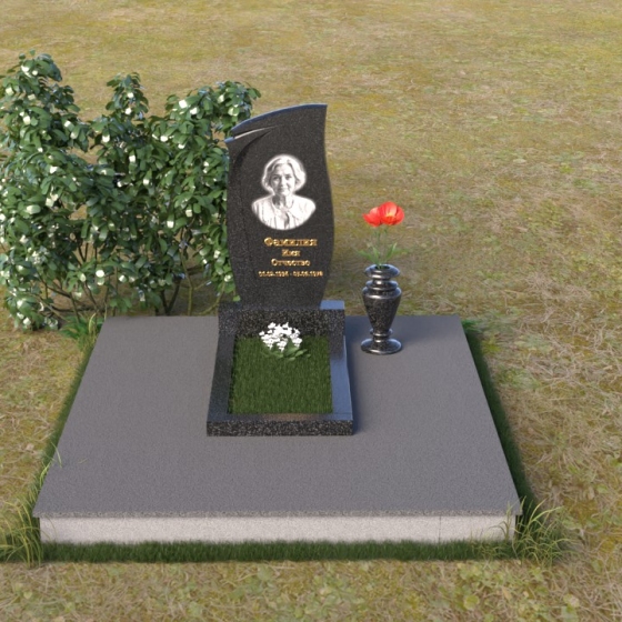Представленная мемориальная композиция (Артикул: ПВ 136) являет собой образец строгости и элегантности, призванный увековечить светлую память об ушедшем. В основе конструкции – массивная стела, чья форма сочетает в себе плавные, почти волнистые линии верха и строгие, прямые углы основания. Эта геометрия символизирует гармонию между земным и небесным, между скорбью и надеждой. Лицевая поверхность стелы отполирована до зеркального блеска, что придает ей особую торжественность и позволяет четко видеть выгравированный портрет и надписи. Боковые грани, напротив, имеют матовую фактуру, создавая деликатный контраст и подчеркивая глубину камня. Сбоку от стелы расположена небольшая тумба, также выполненная в полированном черном граните, что визуально поддерживает основную вертикаль композиции. Дополнительно, в комплект входит горизонтальная плита, облицованная по периметру фаской, что придает ей законченный вид. Она образует единое целое со стелой, формируя прочное и надежное основание для выражения скорби и уважения.