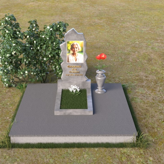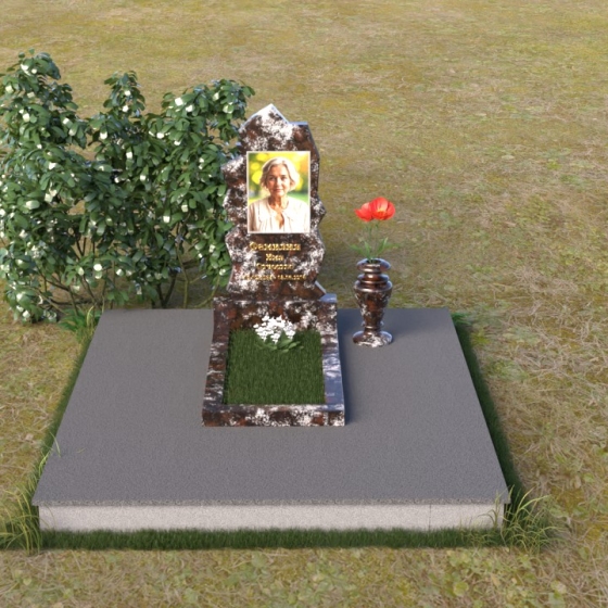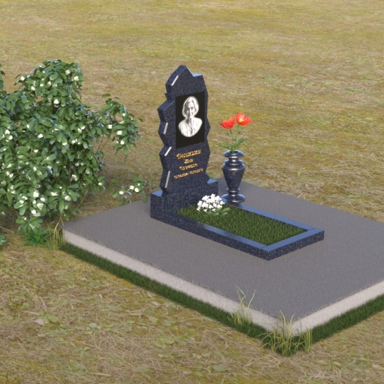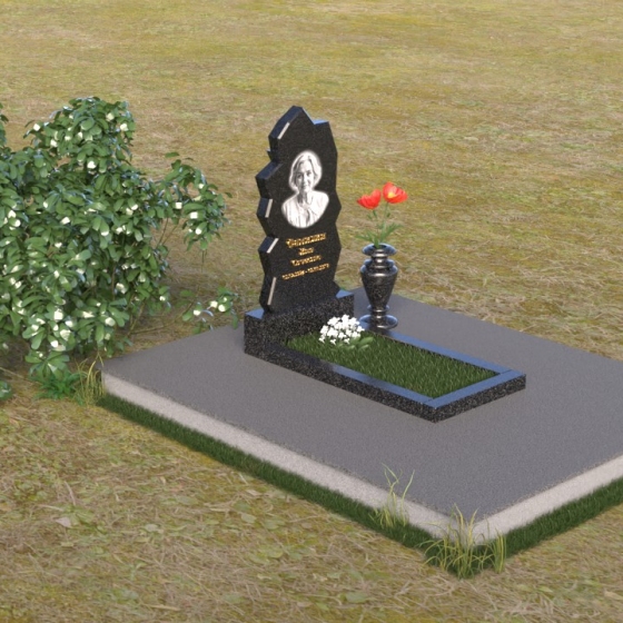 Обратите внимание на уникальную форму стелы. Ее верхняя часть, с неровными, словно обтесанными ветром краями, напоминает горный пик, устремленный ввысь, к небесам. Эти грани, искусно обработанные, создают неповторимую игру света и тени, подчеркивая глубину и многогранность человеческой личности. Зеркальная полировка черного гранита отражает окружающий мир, словно запечатлевая последние мгновения жизни, а матовые участки добавляют рельефности и выразительности. В нижней части стелы мы видим лаконичную прямоугольную плиту, которая служит надежным основанием и символизирует стабильность и незыблемость памяти.